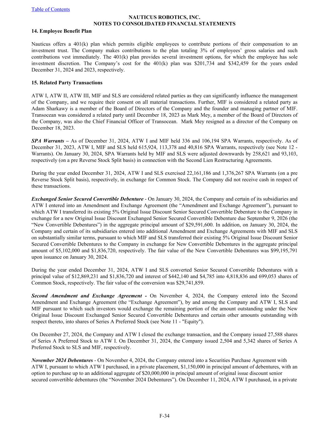 14. Employee Benefit Plan Nauticus offers a 401(k) plan which permits eligible employees to contribute portions of their compensation to an investment trust. The Company makes contributions to the plan totaling 3% of employees’ gross salaries and such contributions vest immediately. The 401(k) plan provides several investment options, for which the employee has sole investment discretion. The Company’s cost for the 401(k) plan was $201,734 and $342,459 for the years ended December 31, 2024 and 2023, respectively. 15. Related Party Transactions ATW I, ATW II, ATW III, MIF and SLS are considered related parties as they can significantly influence the management of the Company, and we require their consent on all material transactions. Further, MIF is considered a related party as Adam Sharkawy is a member of the Board of Directors of the Company and the founder and managing partner of MIF. Transocean was considered a related party until December 18, 2023 as Mark Mey, a member of the Board of Directors of the Company, was also the Chief Financial Officer of Transocean. Mark Mey resigned as a director of the Company on December 18, 2023. SPA Warrants – As of December 31, 2024, ATW I and MIF held 336 and 106,194 SPA Warrants, respectively. As of December 31, 2023, ATW I, MIF and SLS held 615,924, 113,378 and 40,816 SPA Warrants, respectively (see Note 12 - Warrants). On January 30, 2024, SPA Warrants held by MIF and SLS were adjusted downwards by 258,621 and 93,103, respectively (on a pre Reverse Stock Split basis) in connection with the Second Lien Restructuring Agreements. During the year ended December 31, 2024, ATW I and SLS exercised 22,161,186 and 1,376,267 SPA Warrants (on a pre Reverse Stock Split basis), respectively, in exchange for Common Stock. The Company did not receive cash in respect of these transactions. Exchanged Senior Secured Convertible Debenture - On January 30, 2024, the Company and certain of its subsidiaries and ATW I entered into an Amendment and Exchange Agreement (the “Amendment and Exchange Agreement”), pursuant to which ATW I transferred its existing 5% Original Issue Discount Senior Secured Convertible Debenture to the Company in exchange for a new Original Issue Discount Exchanged Senior Secured Convertible Debenture due September 9, 2026 (the “New Convertible Debentures”) in the aggregate principal amount of $29,591,600. In addition, on January 30, 2024, the Company and certain of its subsidiaries entered into additional Amendment and Exchange Agreements with MIF and SLS on substantially similar terms, pursuant to which MIF and SLS transferred their existing 5% Original Issue Discount Senior Secured Convertible Debentures to the Company in exchange for New Convertible Debentures in the aggregate principal amount of $5,102,000 and $1,836,720, respectively. The fair value of the New Convertible Debentures was $99,195,791 upon issuance on January 30, 2024. During the year ended December 31, 2024, ATW I and SLS converted Senior Secured Convertible Debentures with a principal value of $12,869,231 and $1,836,720 and interest of $442,140 and $4,785 into 4,818,836 and 699,053 shares of Common Stock, respectively. The fair value of the conversion was $29,741,859. Second Amendment and Exchange Agreement - On November 4, 2024, the Company entered into the Second Amendment and Exchange Agreement (the “Exchange Agreement”), by and among the Company and ATW I, SLS and MIF pursuant to which such investors would exchange the remaining portion of the amount outstanding under the New Original Issue Discount Exchanged Senior Secured Convertible Debentures and certain other amounts outstanding with respect thereto, into shares of Series A Preferred Stock (see Note 11 - "Equity"). On December 27, 2024, the Company and ATW I closed the exchange transaction, and the Company issued 27,588 shares of Series A Preferred Stock to ATW I. On December 31, 2024, the Company issued 2,504 and 5,342 shares of Series A Preferred Stock to SLS and MIF, respectively. November 2024 Debentures - On November 4, 2024, the Company entered into a Securities Purchase Agreement with ATW I, pursuant to which ATW I purchased, in a private placement, $1,150,000 in principal amount of debentures, with an option to purchase up to an additional aggregate of $20,000,000 in principal amount of original issue discount senior secured convertible debentures (the “November 2024 Debentures”). On December 11, 2024, ATW I purchased, in a private Table of Contents NAUTICUS ROBOTICS, INC. NOTES TO CONSOLIDATED FINANCIAL STATEMENTS F-34