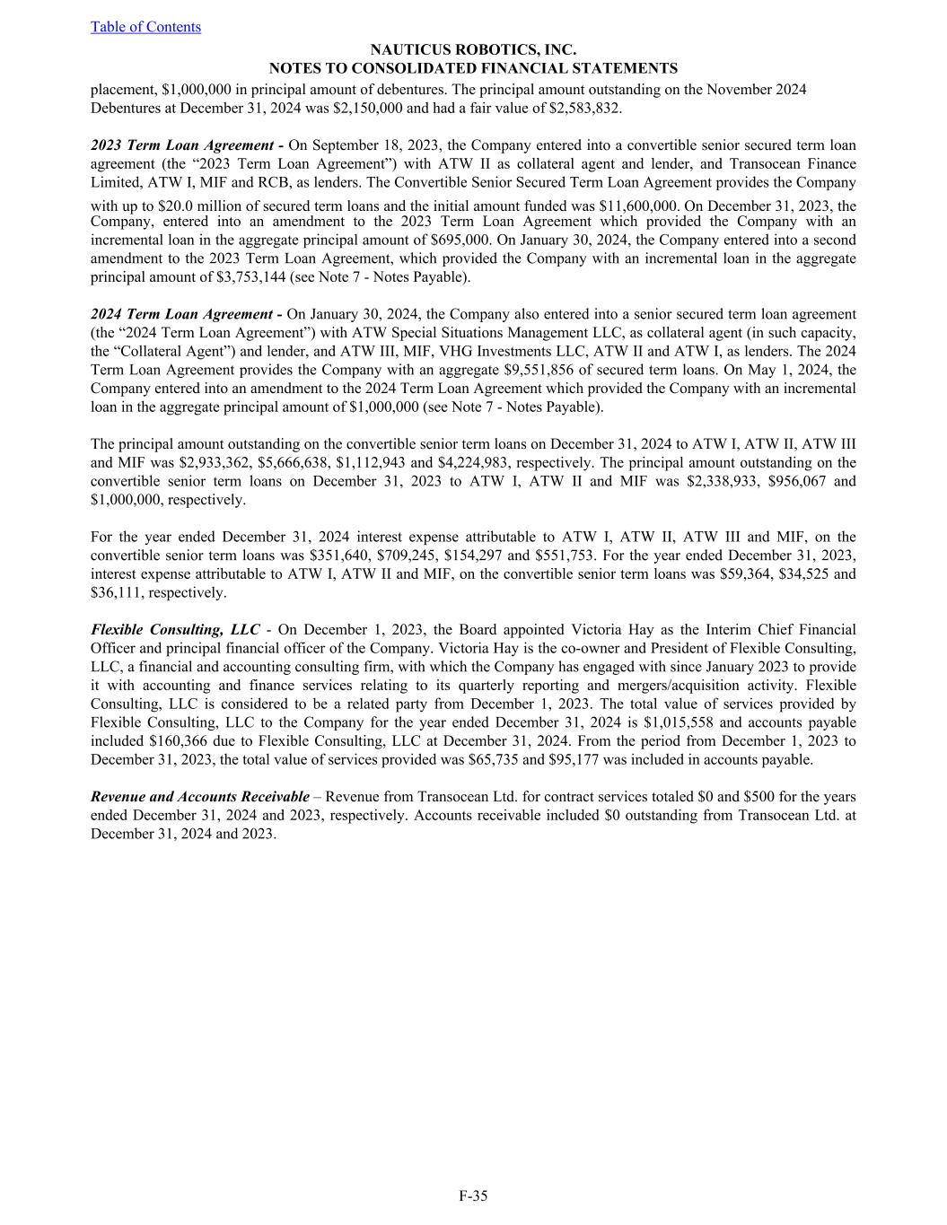 placement, $1,000,000 in principal amount of debentures. The principal amount outstanding on the November 2024 Debentures at December 31, 2024 was $2,150,000 and had a fair value of $2,583,832. 2023 Term Loan Agreement - On September 18, 2023, the Company entered into a convertible senior secured term loan agreement (the “2023 Term Loan Agreement”) with ATW II as collateral agent and lender, and Transocean Finance Limited, ATW I, MIF and RCB, as lenders. The Convertible Senior Secured Term Loan Agreement provides the Company with up to $20.0 million of secured term loans and the initial amount funded was $11,600,000. On December 31, 2023, the Company, entered into an amendment to the 2023 Term Loan Agreement which provided the Company with an incremental loan in the aggregate principal amount of $695,000. On January 30, 2024, the Company entered into a second amendment to the 2023 Term Loan Agreement, which provided the Company with an incremental loan in the aggregate principal amount of $3,753,144 (see Note 7 - Notes Payable). 2024 Term Loan Agreement - On January 30, 2024, the Company also entered into a senior secured term loan agreement (the “2024 Term Loan Agreement”) with ATW Special Situations Management LLC, as collateral agent (in such capacity, the “Collateral Agent”) and lender, and ATW III, MIF, VHG Investments LLC, ATW II and ATW I, as lenders. The 2024 Term Loan Agreement provides the Company with an aggregate $9,551,856 of secured term loans. On May 1, 2024, the Company entered into an amendment to the 2024 Term Loan Agreement which provided the Company with an incremental loan in the aggregate principal amount of $1,000,000 (see Note 7 - Notes Payable). The principal amount outstanding on the convertible senior term loans on December 31, 2024 to ATW I, ATW II, ATW III and MIF was $2,933,362, $5,666,638, $1,112,943 and $4,224,983, respectively. The principal amount outstanding on the convertible senior term loans on December 31, 2023 to ATW I, ATW II and MIF was $2,338,933, $956,067 and $1,000,000, respectively. For the year ended December 31, 2024 interest expense attributable to ATW I, ATW II, ATW III and MIF, on the convertible senior term loans was $351,640, $709,245, $154,297 and $551,753. For the year ended December 31, 2023, interest expense attributable to ATW I, ATW II and MIF, on the convertible senior term loans was $59,364, $34,525 and $36,111, respectively. Flexible Consulting, LLC - On December 1, 2023, the Board appointed Victoria Hay as the Interim Chief Financial Officer and principal financial officer of the Company. Victoria Hay is the co-owner and President of Flexible Consulting, LLC, a financial and accounting consulting firm, with which the Company has engaged with since January 2023 to provide it with accounting and finance services relating to its quarterly reporting and mergers/acquisition activity. Flexible Consulting, LLC is considered to be a related party from December 1, 2023. The total value of services provided by Flexible Consulting, LLC to the Company for the year ended December 31, 2024 is $1,015,558 and accounts payable included $160,366 due to Flexible Consulting, LLC at December 31, 2024. From the period from December 1, 2023 to December 31, 2023, the total value of services provided was $65,735 and $95,177 was included in accounts payable. Revenue and Accounts Receivable – Revenue from Transocean Ltd. for contract services totaled $0 and $500 for the years ended December 31, 2024 and 2023, respectively. Accounts receivable included $0 outstanding from Transocean Ltd. at December 31, 2024 and 2023. Table of Contents NAUTICUS ROBOTICS, INC. NOTES TO CONSOLIDATED FINANCIAL STATEMENTS F-35