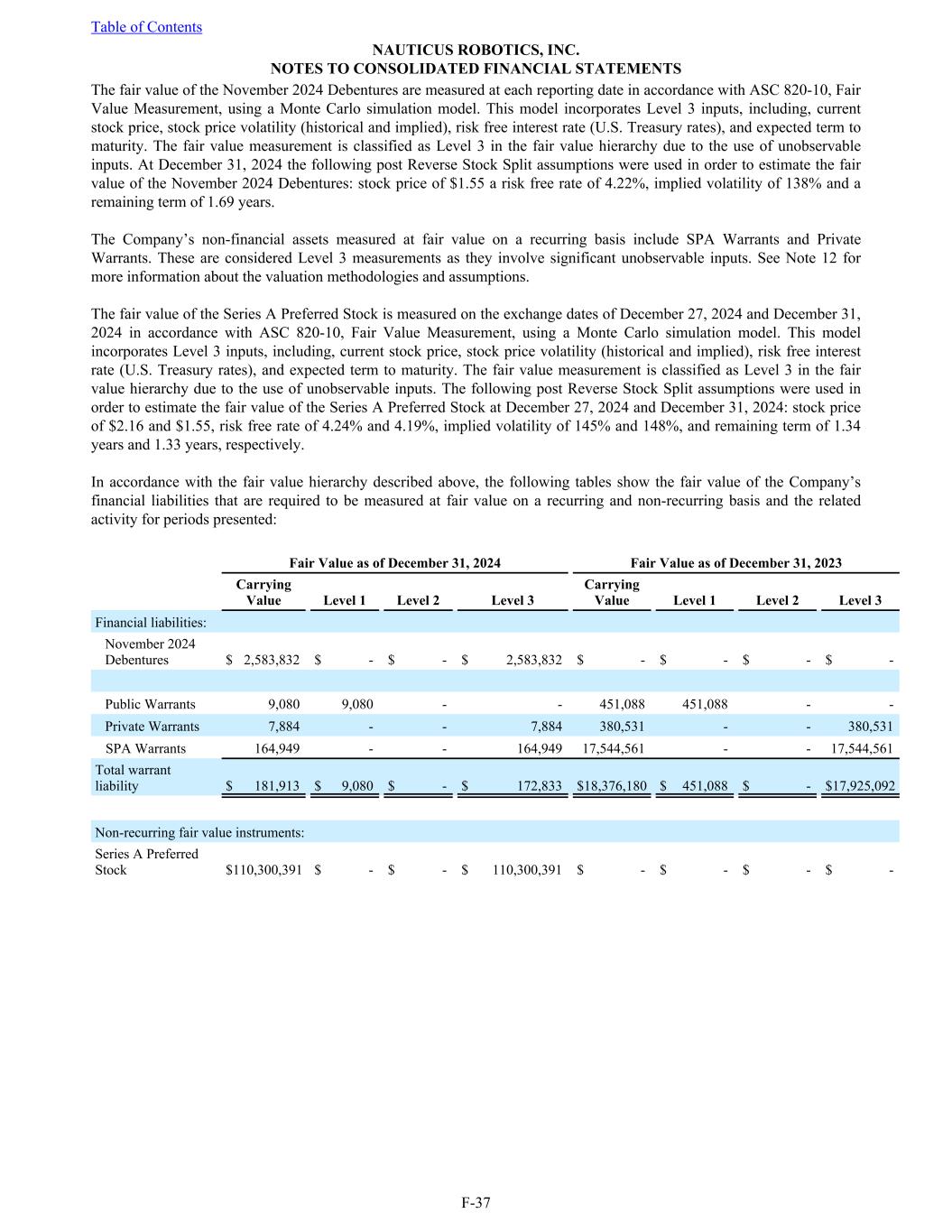 The fair value of the November 2024 Debentures are measured at each reporting date in accordance with ASC 820-10, Fair Value Measurement, using a Monte Carlo simulation model. This model incorporates Level 3 inputs, including, current stock price, stock price volatility (historical and implied), risk free interest rate (U.S. Treasury rates), and expected term to maturity. The fair value measurement is classified as Level 3 in the fair value hierarchy due to the use of unobservable inputs. At December 31, 2024 the following post Reverse Stock Split assumptions were used in order to estimate the fair value of the November 2024 Debentures: stock price of $1.55 a risk free rate of 4.22%, implied volatility of 138% and a remaining term of 1.69 years. The Company’s non-financial assets measured at fair value on a recurring basis include SPA Warrants and Private Warrants. These are considered Level 3 measurements as they involve significant unobservable inputs. See Note 12 for more information about the valuation methodologies and assumptions. The fair value of the Series A Preferred Stock is measured on the exchange dates of December 27, 2024 and December 31, 2024 in accordance with ASC 820-10, Fair Value Measurement, using a Monte Carlo simulation model. This model incorporates Level 3 inputs, including, current stock price, stock price volatility (historical and implied), risk free interest rate (U.S. Treasury rates), and expected term to maturity. The fair value measurement is classified as Level 3 in the fair value hierarchy due to the use of unobservable inputs. The following post Reverse Stock Split assumptions were used in order to estimate the fair value of the Series A Preferred Stock at December 27, 2024 and December 31, 2024: stock price of $2.16 and $1.55, risk free rate of 4.24% and 4.19%, implied volatility of 145% and 148%, and remaining term of 1.34 years and 1.33 years, respectively. In accordance with the fair value hierarchy described above, the following tables show the fair value of the Company’s financial liabilities that are required to be measured at fair value on a recurring and non-recurring basis and the related activity for periods presented: Fair Value as of December 31, 2024 Fair Value as of December 31, 2023 Carrying Value Level 1 Level 2 Level 3 Carrying Value Level 1 Level 2 Level 3 Financial liabilities: November 2024 Debentures $ 2,583,832 $ - $ - $ 2,583,832 $ - $ - $ - $ - Public Warrants 9,080 9,080 - - 451,088 451,088 - - Private Warrants 7,884 - - 7,884 380,531 - - 380,531 SPA Warrants 164,949 - - 164,949 17,544,561 - - 17,544,561 Total warrant liability $ 181,913 $ 9,080 $ - $ 172,833 $ 18,376,180 $ 451,088 $ - $ 17,925,092 Non-recurring fair value instruments: Series A Preferred Stock $ 110,300,391 $ - $ - $ 110,300,391 $ - $ - $ - $ - Table of Contents NAUTICUS ROBOTICS, INC. NOTES TO CONSOLIDATED FINANCIAL STATEMENTS F-37