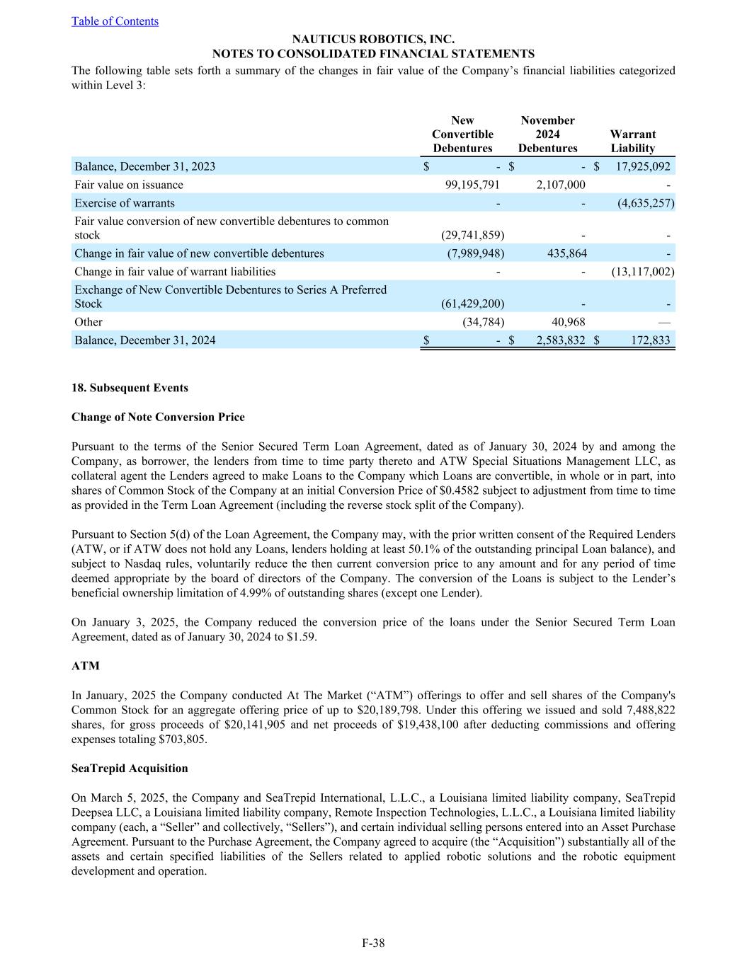 The following table sets forth a summary of the changes in fair value of the Company’s financial liabilities categorized within Level 3: New Convertible Debentures November 2024 Debentures Warrant Liability Balance, December 31, 2023 $ - $ - $ 17,925,092 Fair value on issuance 99,195,791 2,107,000 - Exercise of warrants - - (4,635,257) Fair value conversion of new convertible debentures to common stock (29,741,859) - - Change in fair value of new convertible debentures (7,989,948) 435,864 - Change in fair value of warrant liabilities - - (13,117,002) Exchange of New Convertible Debentures to Series A Preferred Stock (61,429,200) - - Other (34,784) 40,968 — Balance, December 31, 2024 $ - $ 2,583,832 $ 172,833 18. Subsequent Events Change of Note Conversion Price Pursuant to the terms of the Senior Secured Term Loan Agreement, dated as of January 30, 2024 by and among the Company, as borrower, the lenders from time to time party thereto and ATW Special Situations Management LLC, as collateral agent the Lenders agreed to make Loans to the Company which Loans are convertible, in whole or in part, into shares of Common Stock of the Company at an initial Conversion Price of $0.4582 subject to adjustment from time to time as provided in the Term Loan Agreement (including the reverse stock split of the Company). Pursuant to Section 5(d) of the Loan Agreement, the Company may, with the prior written consent of the Required Lenders (ATW, or if ATW does not hold any Loans, lenders holding at least 50.1% of the outstanding principal Loan balance), and subject to Nasdaq rules, voluntarily reduce the then current conversion price to any amount and for any period of time deemed appropriate by the board of directors of the Company. The conversion of the Loans is subject to the Lender’s beneficial ownership limitation of 4.99% of outstanding shares (except one Lender). On January 3, 2025, the Company reduced the conversion price of the loans under the Senior Secured Term Loan Agreement, dated as of January 30, 2024 to $1.59. ATM In January, 2025 the Company conducted At The Market (“ATM”) offerings to offer and sell shares of the Company's Common Stock for an aggregate offering price of up to $20,189,798. Under this offering we issued and sold 7,488,822 shares, for gross proceeds of $20,141,905 and net proceeds of $19,438,100 after deducting commissions and offering expenses totaling $703,805. SeaTrepid Acquisition On March 5, 2025, the Company and SeaTrepid International, L.L.C., a Louisiana limited liability company, SeaTrepid Deepsea LLC, a Louisiana limited liability company, Remote Inspection Technologies, L.L.C., a Louisiana limited liability company (each, a “Seller” and collectively, “Sellers”), and certain individual selling persons entered into an Asset Purchase Agreement. Pursuant to the Purchase Agreement, the Company agreed to acquire (the “Acquisition”) substantially all of the assets and certain specified liabilities of the Sellers related to applied robotic solutions and the robotic equipment development and operation. Table of Contents NAUTICUS ROBOTICS, INC. NOTES TO CONSOLIDATED FINANCIAL STATEMENTS F-38