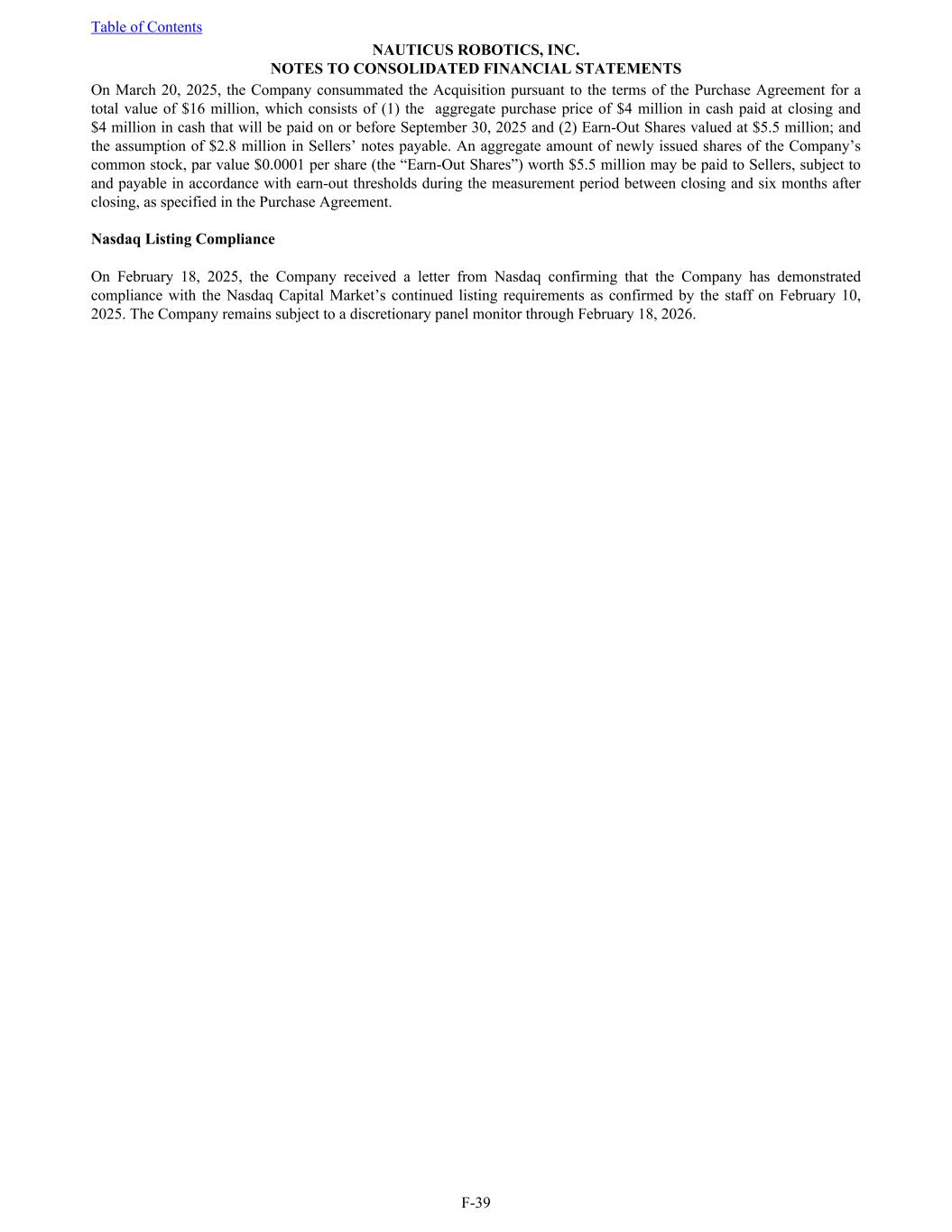 On March 20, 2025, the Company consummated the Acquisition pursuant to the terms of the Purchase Agreement for a total value of $16 million, which consists of (1) the aggregate purchase price of $4 million in cash paid at closing and $4 million in cash that will be paid on or before September 30, 2025 and (2) Earn-Out Shares valued at $5.5 million; and the assumption of $2.8 million in Sellers’ notes payable. An aggregate amount of newly issued shares of the Company’s common stock, par value $0.0001 per share (the “Earn-Out Shares”) worth $5.5 million may be paid to Sellers, subject to and payable in accordance with earn-out thresholds during the measurement period between closing and six months after closing, as specified in the Purchase Agreement. Nasdaq Listing Compliance On February 18, 2025, the Company received a letter from Nasdaq confirming that the Company has demonstrated compliance with the Nasdaq Capital Market’s continued listing requirements as confirmed by the staff on February 10, 2025. The Company remains subject to a discretionary panel monitor through February 18, 2026. Table of Contents NAUTICUS ROBOTICS, INC. NOTES TO CONSOLIDATED FINANCIAL STATEMENTS F-39
