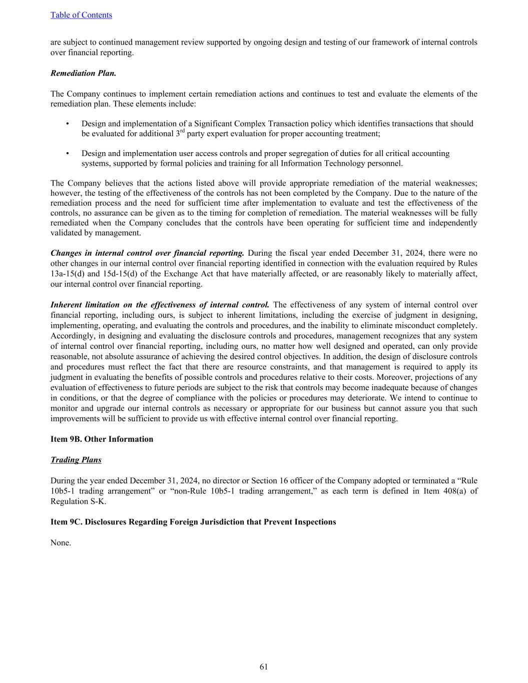 are subject to continued management review supported by ongoing design and testing of our framework of internal controls over financial reporting. Remediation Plan. The Company continues to implement certain remediation actions and continues to test and evaluate the elements of the remediation plan. These elements include: • Design and implementation of a Significant Complex Transaction policy which identifies transactions that should be evaluated for additional 3rd party expert evaluation for proper accounting treatment; • Design and implementation user access controls and proper segregation of duties for all critical accounting systems, supported by formal policies and training for all Information Technology personnel. The Company believes that the actions listed above will provide appropriate remediation of the material weaknesses; however, the testing of the effectiveness of the controls has not been completed by the Company. Due to the nature of the remediation process and the need for sufficient time after implementation to evaluate and test the effectiveness of the controls, no assurance can be given as to the timing for completion of remediation. The material weaknesses will be fully remediated when the Company concludes that the controls have been operating for sufficient time and independently validated by management. Changes in internal control over financial reporting. During the fiscal year ended December 31, 2024, there were no other changes in our internal control over financial reporting identified in connection with the evaluation required by Rules 13a-15(d) and 15d-15(d) of the Exchange Act that have materially affected, or are reasonably likely to materially affect, our internal control over financial reporting. Inherent limitation on the effectiveness of internal control. The effectiveness of any system of internal control over financial reporting, including ours, is subject to inherent limitations, including the exercise of judgment in designing, implementing, operating, and evaluating the controls and procedures, and the inability to eliminate misconduct completely. Accordingly, in designing and evaluating the disclosure controls and procedures, management recognizes that any system of internal control over financial reporting, including ours, no matter how well designed and operated, can only provide reasonable, not absolute assurance of achieving the desired control objectives. In addition, the design of disclosure controls and procedures must reflect the fact that there are resource constraints, and that management is required to apply its judgment in evaluating the benefits of possible controls and procedures relative to their costs. Moreover, projections of any evaluation of effectiveness to future periods are subject to the risk that controls may become inadequate because of changes in conditions, or that the degree of compliance with the policies or procedures may deteriorate. We intend to continue to monitor and upgrade our internal controls as necessary or appropriate for our business but cannot assure you that such improvements will be sufficient to provide us with effective internal control over financial reporting. Item 9B. Other Information Trading Plans During the year ended December 31, 2024, no director or Section 16 officer of the Company adopted or terminated a “Rule 10b5-1 trading arrangement” or “non-Rule 10b5-1 trading arrangement,” as each term is defined in Item 408(a) of Regulation S-K. Item 9C. Disclosures Regarding Foreign Jurisdiction that Prevent Inspections None. Table of Contents 61