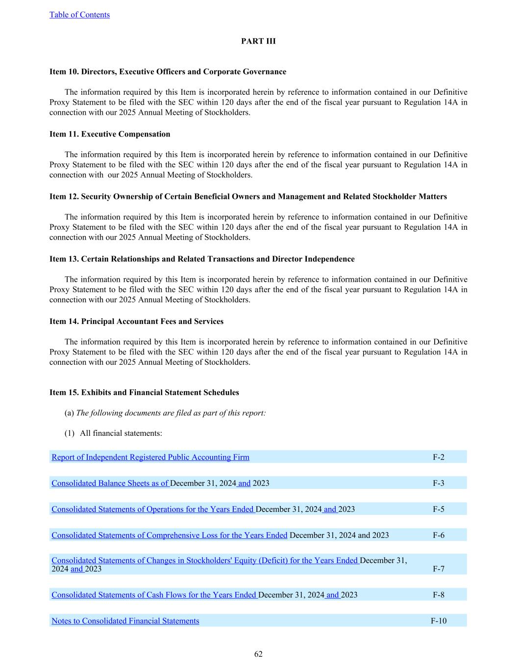 PART III Item 10. Directors, Executive Officers and Corporate Governance The information required by this Item is incorporated herein by reference to information contained in our Definitive Proxy Statement to be filed with the SEC within 120 days after the end of the fiscal year pursuant to Regulation 14A in connection with our 2025 Annual Meeting of Stockholders. Item 11. Executive Compensation The information required by this Item is incorporated herein by reference to information contained in our Definitive Proxy Statement to be filed with the SEC within 120 days after the end of the fiscal year pursuant to Regulation 14A in connection with our 2025 Annual Meeting of Stockholders. Item 12. Security Ownership of Certain Beneficial Owners and Management and Related Stockholder Matters The information required by this Item is incorporated herein by reference to information contained in our Definitive Proxy Statement to be filed with the SEC within 120 days after the end of the fiscal year pursuant to Regulation 14A in connection with our 2025 Annual Meeting of Stockholders. Item 13. Certain Relationships and Related Transactions and Director Independence The information required by this Item is incorporated herein by reference to information contained in our Definitive Proxy Statement to be filed with the SEC within 120 days after the end of the fiscal year pursuant to Regulation 14A in connection with our 2025 Annual Meeting of Stockholders. Item 14. Principal Accountant Fees and Services The information required by this Item is incorporated herein by reference to information contained in our Definitive Proxy Statement to be filed with the SEC within 120 days after the end of the fiscal year pursuant to Regulation 14A in connection with our 2025 Annual Meeting of Stockholders. Item 15. Exhibits and Financial Statement Schedules (a) The following documents are filed as part of this report: (1) All financial statements: Report of Independent Registered Public Accounting Firm F-2 Consolidated Balance Sheets as of December 31, 2024 and 2023 F-3 Consolidated Statements of Operations for the Years Ended December 31, 2024 and 2023 F-5 Consolidated Statements of Comprehensive Loss for the Years Ended December 31, 2024 and 2023 F-6 Consolidated Statements of Changes in Stockholders' Equity (Deficit) for the Years Ended December 31, 2024 and 2023 F-7 Consolidated Statements of Cash Flows for the Years Ended December 31, 2024 and 2023 F-8 Notes to Consolidated Financial Statements F-10 Table of Contents 62