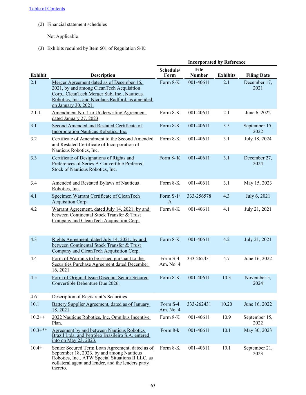 (2) Financial statement schedules Not Applicable (3) Exhibits required by Item 601 of Regulation S-K: 2.1 Merger Agreement dated as of December 16, 2021, by and among CleanTech Acquisition Corp., CleanTech Merger Sub, Inc., Nauticus Robotics, Inc., and Nicolaus Radford, as amended on January 30, 2021. Form 8-K 001-40611 2.1 December 17, 2021 2.1.1 Amendment No. 1 to Underwriting Agreement dated January 27, 2023 Form 8-K 001-40611 2.1 June 6, 2022 3.1 Second Amended and Restated Certificate of Incorporation Nauticus Robotics, Inc. Form 8-K 001-40611 3.5 September 15, 2022 3.2 Certificate of Amendment to the Second Amended and Restated Certificate of Incorporation of Nauticus Robotics, Inc. Form 8-K 001-40611 3.1 July 18, 2024 3.3 Certificate of Designations of Rights and Preferences of Series A Convertible Preferred Stock of Nauticus Robotics, Inc. Form 8- K 001-40611 3.1 December 27, 2024 3.4 Amended and Restated Bylaws of Nauticus Robotics, Inc. Form 8-K 001-40611 3.1 May 15, 2023 4.1 Specimen Warrant Certificate of CleanTech Acquisition Corp. Form S-1/ A 333-256578 4.3 July 6, 2021 4.2 Warrant Agreement, dated July 14, 2021, by and between Continental Stock Transfer & Trust Company and CleanTech Acquisition Corp. Form 8-K 001-40611 4.1 July 21, 2021 4.3 Rights Agreement, dated July 14, 2021, by and between Continental Stock Transfer & Trust Company and CleanTech Acquisition Corp. Form 8-K 001-40611 4.2 July 21, 2021 4.4 Form of Warrants to be issued pursuant to the Securities Purchase Agreement dated December 16, 2021 Form S-4 Am. No. 4 333-262431 4.7 June 16, 2022 4.5 Form of Original Issue Discount Senior Secured Convertible Debenture Due 2026. Form 8-K 001-40611 10.3 November 5, 2024 4.6† Description of Registrant’s Securities 10.1 Battery Supplier Agreement, dated as of January 18, 2021. Form S-4 Am. No. 4 333-262431 10.20 June 16, 2022 10.2++ 2022 Nauticus Robotics, Inc. Omnibus Incentive Plan. Form 8-K 001-40611 10.9 September 15, 2022 10.3+** Agreement by and between Nauticus Robotics Brazil Ltda. and Petróleo Brasileiro S.A. entered into on May 23, 2023. Form 8-k 001-40611 10.1 May 30, 2023 10.4+ Senior Secured Term Loan Agreement, dated as of September 18, 2023, by and among Nauticus Robotics, Inc., ATW Special Situations II LLC, as collateral agent and lender, and the lenders party thereto. Form 8-K 001-40611 10.1 September 21, 2023 Incorporated by Reference Exhibit Description Schedule/ Form File Number Exhibits Filing Date Table of Contents 63