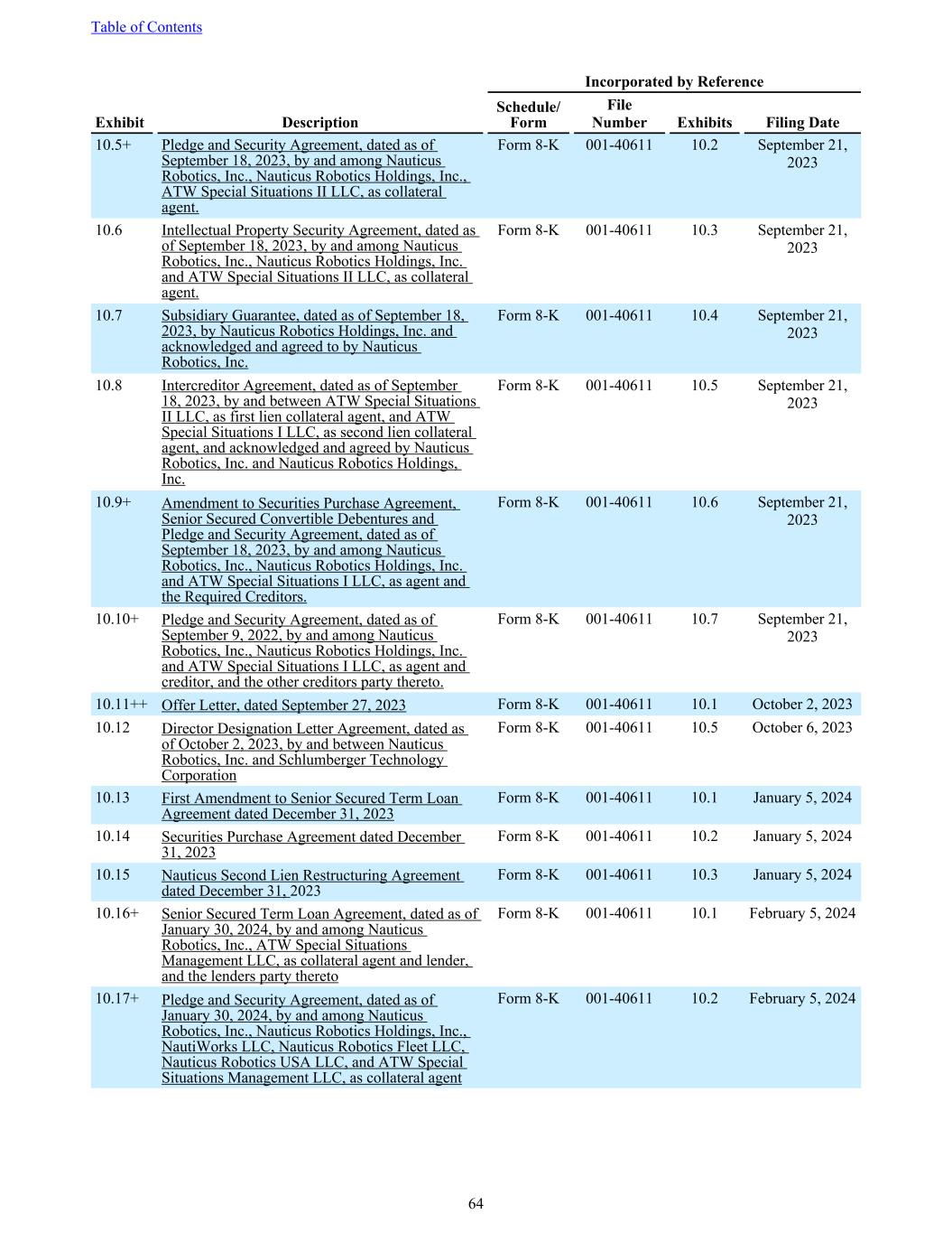 10.5+ Pledge and Security Agreement, dated as of September 18, 2023, by and among Nauticus Robotics, Inc., Nauticus Robotics Holdings, Inc., ATW Special Situations II LLC, as collateral agent. Form 8-K 001-40611 10.2 September 21, 2023 10.6 Intellectual Property Security Agreement, dated as of September 18, 2023, by and among Nauticus Robotics, Inc., Nauticus Robotics Holdings, Inc. and ATW Special Situations II LLC, as collateral agent. Form 8-K 001-40611 10.3 September 21, 2023 10.7 Subsidiary Guarantee, dated as of September 18, 2023, by Nauticus Robotics Holdings, Inc. and acknowledged and agreed to by Nauticus Robotics, Inc. Form 8-K 001-40611 10.4 September 21, 2023 10.8 Intercreditor Agreement, dated as of September 18, 2023, by and between ATW Special Situations II LLC, as first lien collateral agent, and ATW Special Situations I LLC, as second lien collateral agent, and acknowledged and agreed by Nauticus Robotics, Inc. and Nauticus Robotics Holdings, Inc. Form 8-K 001-40611 10.5 September 21, 2023 10.9+ Amendment to Securities Purchase Agreement, Senior Secured Convertible Debentures and Pledge and Security Agreement, dated as of September 18, 2023, by and among Nauticus Robotics, Inc., Nauticus Robotics Holdings, Inc. and ATW Special Situations I LLC, as agent and the Required Creditors. Form 8-K 001-40611 10.6 September 21, 2023 10.10+ Pledge and Security Agreement, dated as of September 9, 2022, by and among Nauticus Robotics, Inc., Nauticus Robotics Holdings, Inc. and ATW Special Situations I LLC, as agent and creditor, and the other creditors party thereto. Form 8-K 001-40611 10.7 September 21, 2023 10.11++ Offer Letter, dated September 27, 2023 Form 8-K 001-40611 10.1 October 2, 2023 10.12 Director Designation Letter Agreement, dated as of October 2, 2023, by and between Nauticus Robotics, Inc. and Schlumberger Technology Corporation Form 8-K 001-40611 10.5 October 6, 2023 10.13 First Amendment to Senior Secured Term Loan Agreement dated December 31, 2023 Form 8-K 001-40611 10.1 January 5, 2024 10.14 Securities Purchase Agreement dated December 31, 2023 Form 8-K 001-40611 10.2 January 5, 2024 10.15 Nauticus Second Lien Restructuring Agreement dated December 31, 2023 Form 8-K 001-40611 10.3 January 5, 2024 10.16+ Senior Secured Term Loan Agreement, dated as of January 30, 2024, by and among Nauticus Robotics, Inc., ATW Special Situations Management LLC, as collateral agent and lender, and the lenders party thereto Form 8-K 001-40611 10.1 February 5, 2024 10.17+ Pledge and Security Agreement, dated as of January 30, 2024, by and among Nauticus Robotics, Inc., Nauticus Robotics Holdings, Inc., NautiWorks LLC, Nauticus Robotics Fleet LLC, Nauticus Robotics USA LLC, and ATW Special Situations Management LLC, as collateral agent Form 8-K 001-40611 10.2 February 5, 2024 Incorporated by Reference Exhibit Description Schedule/ Form File Number Exhibits Filing Date Table of Contents 64
