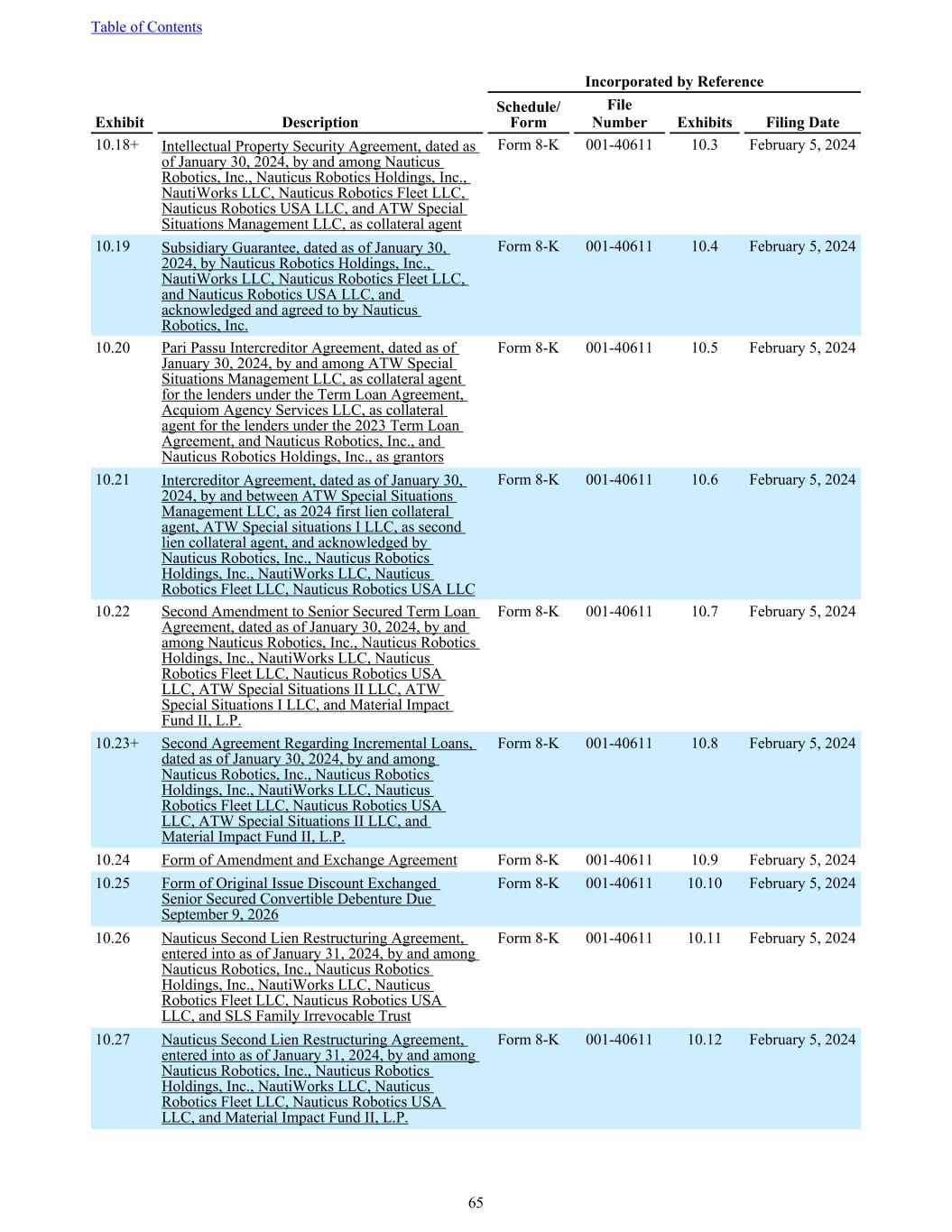 10.18+ Intellectual Property Security Agreement, dated as of January 30, 2024, by and among Nauticus Robotics, Inc., Nauticus Robotics Holdings, Inc., NautiWorks LLC, Nauticus Robotics Fleet LLC, Nauticus Robotics USA LLC, and ATW Special Situations Management LLC, as collateral agent Form 8-K 001-40611 10.3 February 5, 2024 10.19 Subsidiary Guarantee, dated as of January 30, 2024, by Nauticus Robotics Holdings, Inc., NautiWorks LLC, Nauticus Robotics Fleet LLC, and Nauticus Robotics USA LLC, and acknowledged and agreed to by Nauticus Robotics, Inc. Form 8-K 001-40611 10.4 February 5, 2024 10.20 Pari Passu Intercreditor Agreement, dated as of January 30, 2024, by and among ATW Special Situations Management LLC, as collateral agent for the lenders under the Term Loan Agreement, Acquiom Agency Services LLC, as collateral agent for the lenders under the 2023 Term Loan Agreement, and Nauticus Robotics, Inc., and Nauticus Robotics Holdings, Inc., as grantors Form 8-K 001-40611 10.5 February 5, 2024 10.21 Intercreditor Agreement, dated as of January 30, 2024, by and between ATW Special Situations Management LLC, as 2024 first lien collateral agent, ATW Special situations I LLC, as second lien collateral agent, and acknowledged by Nauticus Robotics, Inc., Nauticus Robotics Holdings, Inc., NautiWorks LLC, Nauticus Robotics Fleet LLC, Nauticus Robotics USA LLC Form 8-K 001-40611 10.6 February 5, 2024 10.22 Second Amendment to Senior Secured Term Loan Agreement, dated as of January 30, 2024, by and among Nauticus Robotics, Inc., Nauticus Robotics Holdings, Inc., NautiWorks LLC, Nauticus Robotics Fleet LLC, Nauticus Robotics USA LLC, ATW Special Situations II LLC, ATW Special Situations I LLC, and Material Impact Fund II, L.P. Form 8-K 001-40611 10.7 February 5, 2024 10.23+ Second Agreement Regarding Incremental Loans, dated as of January 30, 2024, by and among Nauticus Robotics, Inc., Nauticus Robotics Holdings, Inc., NautiWorks LLC, Nauticus Robotics Fleet LLC, Nauticus Robotics USA LLC, ATW Special Situations II LLC, and Material Impact Fund II, L.P. Form 8-K 001-40611 10.8 February 5, 2024 10.24 Form of Amendment and Exchange Agreement Form 8-K 001-40611 10.9 February 5, 2024 10.25 Form of Original Issue Discount Exchanged Senior Secured Convertible Debenture Due September 9, 2026 Form 8-K 001-40611 10.10 February 5, 2024 10.26 Nauticus Second Lien Restructuring Agreement, entered into as of January 31, 2024, by and among Nauticus Robotics, Inc., Nauticus Robotics Holdings, Inc., NautiWorks LLC, Nauticus Robotics Fleet LLC, Nauticus Robotics USA LLC, and SLS Family Irrevocable Trust Form 8-K 001-40611 10.11 February 5, 2024 10.27 Nauticus Second Lien Restructuring Agreement, entered into as of January 31, 2024, by and among Nauticus Robotics, Inc., Nauticus Robotics Holdings, Inc., NautiWorks LLC, Nauticus Robotics Fleet LLC, Nauticus Robotics USA LLC, and Material Impact Fund II, L.P. Form 8-K 001-40611 10.12 February 5, 2024 Incorporated by Reference Exhibit Description Schedule/ Form File Number Exhibits Filing Date Table of Contents 65