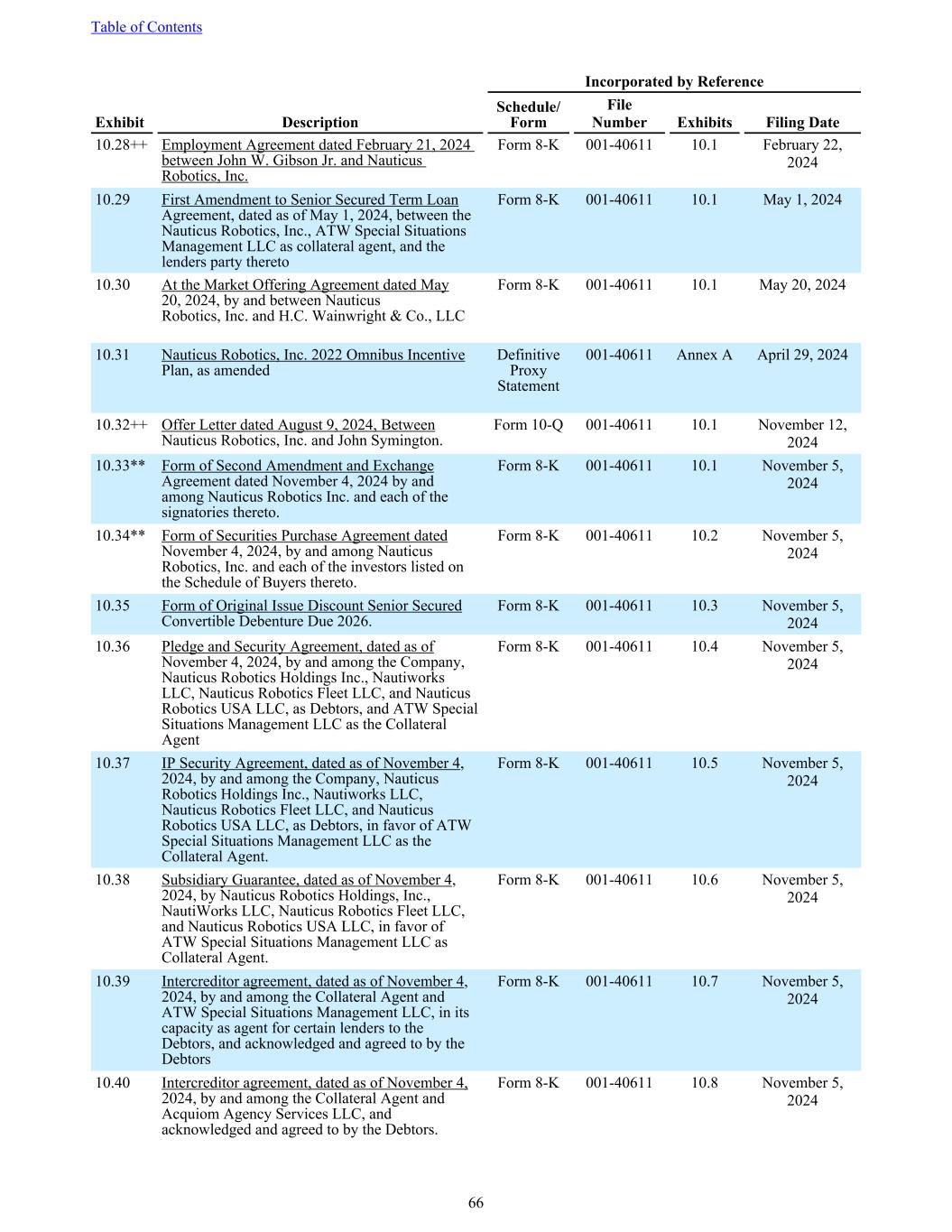 10.28++ Employment Agreement dated February 21, 2024 between John W. Gibson Jr. and Nauticus Robotics, Inc. Form 8-K 001-40611 10.1 February 22, 2024 10.29 First Amendment to Senior Secured Term Loan Agreement, dated as of May 1, 2024, between the Nauticus Robotics, Inc., ATW Special Situations Management LLC as collateral agent, and the lenders party thereto Form 8-K 001-40611 10.1 May 1, 2024 10.30 At the Market Offering Agreement dated May 20, 2024, by and between Nauticus Robotics, Inc. and H.C. Wainwright & Co., LLC Form 8-K 001-40611 10.1 May 20, 2024 10.31 Nauticus Robotics, Inc. 2022 Omnibus Incentive Plan, as amended Definitive Proxy Statement 001-40611 Annex A April 29, 2024 10.32++ Offer Letter dated August 9, 2024, Between Nauticus Robotics, Inc. and John Symington. Form 10-Q 001-40611 10.1 November 12, 2024 10.33** Form of Second Amendment and Exchange Agreement dated November 4, 2024 by and among Nauticus Robotics Inc. and each of the signatories thereto. Form 8-K 001-40611 10.1 November 5, 2024 10.34** Form of Securities Purchase Agreement dated November 4, 2024, by and among Nauticus Robotics, Inc. and each of the investors listed on the Schedule of Buyers thereto. Form 8-K 001-40611 10.2 November 5, 2024 10.35 Form of Original Issue Discount Senior Secured Convertible Debenture Due 2026. Form 8-K 001-40611 10.3 November 5, 2024 10.36 Pledge and Security Agreement, dated as of November 4, 2024, by and among the Company, Nauticus Robotics Holdings Inc., Nautiworks LLC, Nauticus Robotics Fleet LLC, and Nauticus Robotics USA LLC, as Debtors, and ATW Special Situations Management LLC as the Collateral Agent Form 8-K 001-40611 10.4 November 5, 2024 10.37 IP Security Agreement, dated as of November 4, 2024, by and among the Company, Nauticus Robotics Holdings Inc., Nautiworks LLC, Nauticus Robotics Fleet LLC, and Nauticus Robotics USA LLC, as Debtors, in favor of ATW Special Situations Management LLC as the Collateral Agent. Form 8-K 001-40611 10.5 November 5, 2024 10.38 Subsidiary Guarantee, dated as of November 4, 2024, by Nauticus Robotics Holdings, Inc., NautiWorks LLC, Nauticus Robotics Fleet LLC, and Nauticus Robotics USA LLC, in favor of ATW Special Situations Management LLC as Collateral Agent. Form 8-K 001-40611 10.6 November 5, 2024 10.39 Intercreditor agreement, dated as of November 4, 2024, by and among the Collateral Agent and ATW Special Situations Management LLC, in its capacity as agent for certain lenders to the Debtors, and acknowledged and agreed to by the Debtors Form 8-K 001-40611 10.7 November 5, 2024 10.40 Intercreditor agreement, dated as of November 4, 2024, by and among the Collateral Agent and Acquiom Agency Services LLC, and acknowledged and agreed to by the Debtors. Form 8-K 001-40611 10.8 November 5, 2024 Incorporated by Reference Exhibit Description Schedule/ Form File Number Exhibits Filing Date Table of Contents 66