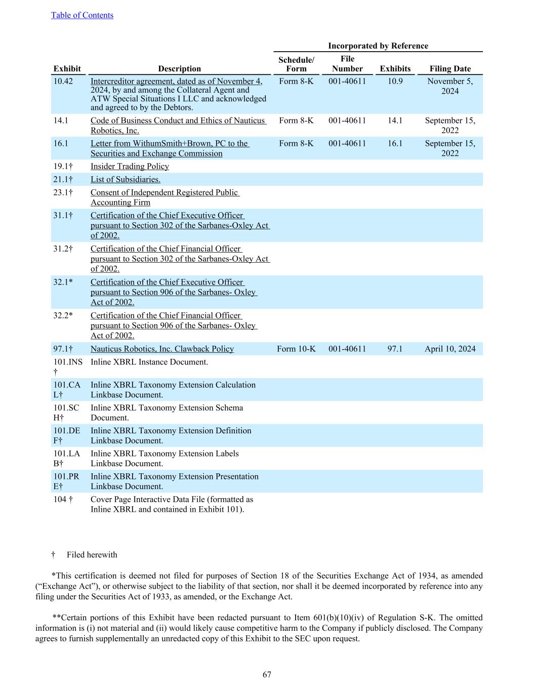 10.42 Intercreditor agreement, dated as of November 4, 2024, by and among the Collateral Agent and ATW Special Situations I LLC and acknowledged and agreed to by the Debtors. Form 8-K 001-40611 10.9 November 5, 2024 14.1 Code of Business Conduct and Ethics of Nauticus Robotics, Inc. Form 8-K 001-40611 14.1 September 15, 2022 16.1 Letter from WithumSmith+Brown, PC to the Securities and Exchange Commission Form 8-K 001-40611 16.1 September 15, 2022 19.1† Insider Trading Policy 21.1† List of Subsidiaries. 23.1† Consent of Independent Registered Public Accounting Firm 31.1† Certification of the Chief Executive Officer pursuant to Section 302 of the Sarbanes-Oxley Act of 2002. 31.2† Certification of the Chief Financial Officer pursuant to Section 302 of the Sarbanes-Oxley Act of 2002. 32.1* Certification of the Chief Executive Officer pursuant to Section 906 of the Sarbanes- Oxley Act of 2002. 32.2* Certification of the Chief Financial Officer pursuant to Section 906 of the Sarbanes- Oxley Act of 2002. 97.1† Nauticus Robotics, Inc. Clawback Policy Form 10-K 001-40611 97.1 April 10, 2024 101.INS † Inline XBRL Instance Document. 101.CA L† Inline XBRL Taxonomy Extension Calculation Linkbase Document. 101.SC H† Inline XBRL Taxonomy Extension Schema Document. 101.DE F† Inline XBRL Taxonomy Extension Definition Linkbase Document. 101.LA B† Inline XBRL Taxonomy Extension Labels Linkbase Document. 101.PR E† Inline XBRL Taxonomy Extension Presentation Linkbase Document. 104 † Cover Page Interactive Data File (formatted as Inline XBRL and contained in Exhibit 101). Incorporated by Reference Exhibit Description Schedule/ Form File Number Exhibits Filing Date † Filed herewith *This certification is deemed not filed for purposes of Section 18 of the Securities Exchange Act of 1934, as amended (“Exchange Act”), or otherwise subject to the liability of that section, nor shall it be deemed incorporated by reference into any filing under the Securities Act of 1933, as amended, or the Exchange Act. **Certain portions of this Exhibit have been redacted pursuant to Item 601(b)(10)(iv) of Regulation S-K. The omitted information is (i) not material and (ii) would likely cause competitive harm to the Company if publicly disclosed. The Company agrees to furnish supplementally an unredacted copy of this Exhibit to the SEC upon request. Table of Contents 67