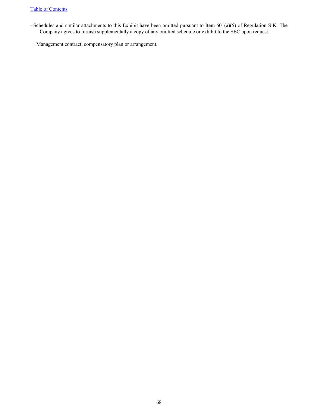 +Schedules and similar attachments to this Exhibit have been omitted pursuant to Item 601(a)(5) of Regulation S-K. The Company agrees to furnish supplementally a copy of any omitted schedule or exhibit to the SEC upon request. ++Management contract, compensatory plan or arrangement. Table of Contents 68