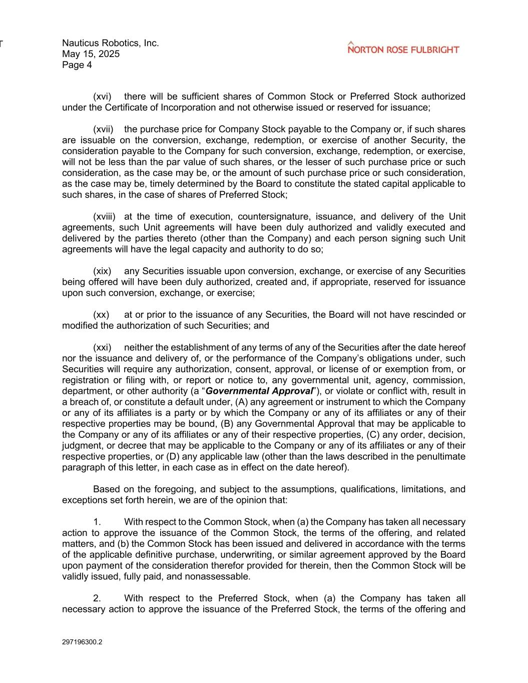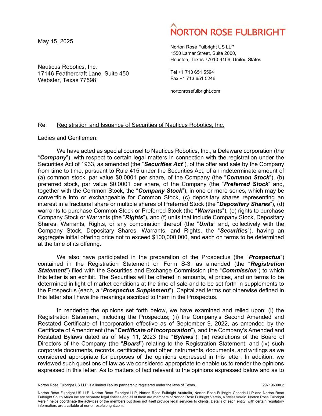 Nauticus Robotics, Inc. May 15, 2025 Page 4 297196300.2 (xvi) there will be sufficient shares of Common Stock or Preferred Stock authorized under the Certificate of Incorporation and not otherwise issued or reserved for issuance; (xvii) the purchase price for Company Stock payable to the Company or, if such shares are issuable on the conversion, exchange, redemption, or exercise of another Security, the consideration payable to the Company for such conversion, exchange, redemption, or exercise, will not be less than the par value of such shares, or the lesser of such purchase price or such consideration, as the case may be, or the amount of such purchase price or such consideration, as the case may be, timely determined by the Board to constitute the stated capital applicable to such shares, in the case of shares of Preferred Stock; (xviii) at the time of execution, countersignature, issuance, and delivery of the Unit agreements, such Unit agreements will have been duly authorized and validly executed and delivered by the parties thereto (other than the Company) and each person signing such Unit agreements will have the legal capacity and authority to do so; (xix) any Securities issuable upon conversion, exchange, or exercise of any Securities being offered will have been duly authorized, created and, if appropriate, reserved for issuance upon such conversion, exchange, or exercise; (xx) at or prior to the issuance of any Securities, the Board will not have rescinded or modified the authorization of such Securities; and (xxi) neither the establishment of any terms of any of the Securities after the date hereof nor the issuance and delivery of, or the performance of the Company’s obligations under, such Securities will require any authorization, consent, approval, or license of or exemption from, or registration or filing with, or report or notice to, any governmental unit, agency, commission, department, or other authority (a “Governmental Approval”), or violate or conflict with, result in a breach of, or constitute a default under, (A) any agreement or instrument to which the Company or any of its affiliates is a party or by which the Company or any of its affiliates or any of their respective properties may be bound, (B) any Governmental Approval that may be applicable to the Company or any of its affiliates or any of their respective properties, (C) any order, decision, judgment, or decree that may be applicable to the Company or any of its affiliates or any of their respective properties, or (D) any applicable law (other than the laws described in the penultimate paragraph of this letter, in each case as in effect on the date hereof). Based on the foregoing, and subject to the assumptions, qualifications, limitations, and exceptions set forth herein, we are of the opinion that: 1. With respect to the Common Stock, when (a) the Company has taken all necessary action to approve the issuance of the Common Stock, the terms of the offering, and related matters, and (b) the Common Stock has been issued and delivered in accordance with the terms of the applicable definitive purchase, underwriting, or similar agreement approved by the Board upon payment of the consideration therefor provided for therein, then the Common Stock will be validly issued, fully paid, and nonassessable. 2. With respect to the Preferred Stock, when (a) the Company has taken all necessary action to approve the issuance of the Preferred Stock, the terms of the offering and