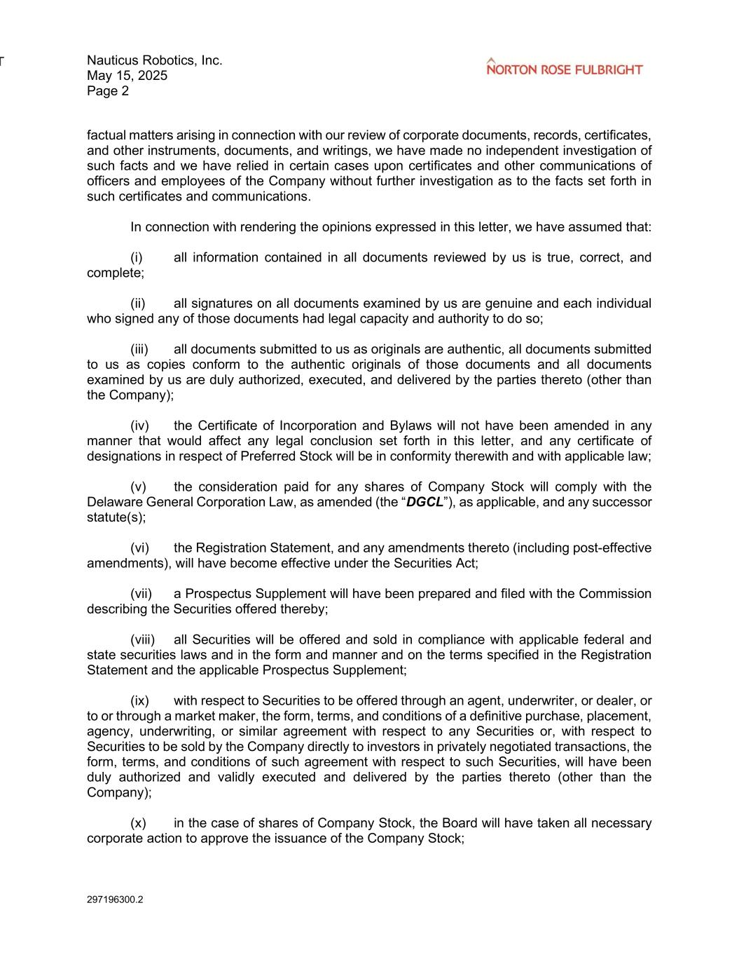 Nauticus Robotics, Inc. May 15, 2025 Page 2 297196300.2 factual matters arising in connection with our review of corporate documents, records, certificates, and other instruments, documents, and writings, we have made no independent investigation of such facts and we have relied in certain cases upon certificates and other communications of officers and employees of the Company without further investigation as to the facts set forth in such certificates and communications. In connection with rendering the opinions expressed in this letter, we have assumed that: (i) all information contained in all documents reviewed by us is true, correct, and complete; (ii) all signatures on all documents examined by us are genuine and each individual who signed any of those documents had legal capacity and authority to do so; (iii) all documents submitted to us as originals are authentic, all documents submitted to us as copies conform to the authentic originals of those documents and all documents examined by us are duly authorized, executed, and delivered by the parties thereto (other than the Company); (iv) the Certificate of Incorporation and Bylaws will not have been amended in any manner that would affect any legal conclusion set forth in this letter, and any certificate of designations in respect of Preferred Stock will be in conformity therewith and with applicable law; (v) the consideration paid for any shares of Company Stock will comply with the Delaware General Corporation Law, as amended (the “DGCL”), as applicable, and any successor statute(s); (vi) the Registration Statement, and any amendments thereto (including post-effective amendments), will have become effective under the Securities Act; (vii) a Prospectus Supplement will have been prepared and filed with the Commission describing the Securities offered thereby; (viii) all Securities will be offered and sold in compliance with applicable federal and state securities laws and in the form and manner and on the terms specified in the Registration Statement and the applicable Prospectus Supplement; (ix) with respect to Securities to be offered through an agent, underwriter, or dealer, or to or through a market maker, the form, terms, and conditions of a definitive purchase, placement, agency, underwriting, or similar agreement with respect to any Securities or, with respect to Securities to be sold by the Company directly to investors in privately negotiated transactions, the form, terms, and conditions of such agreement with respect to such Securities, will have been duly authorized and validly executed and delivered by the parties thereto (other than the Company); (x) in the case of shares of Company Stock, the Board will have taken all necessary corporate action to approve the issuance of the Company Stock;