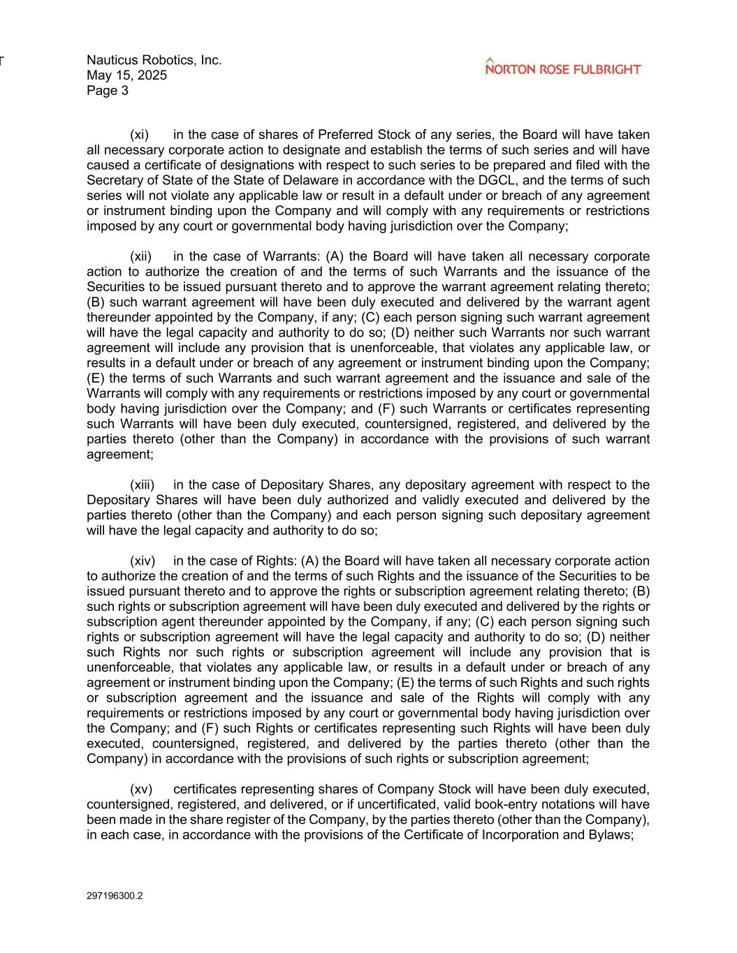 Nauticus Robotics, Inc. May 15, 2025 Page 3 297196300.2 (xi) in the case of shares of Preferred Stock of any series, the Board will have taken all necessary corporate action to designate and establish the terms of such series and will have caused a certificate of designations with respect to such series to be prepared and filed with the Secretary of State of the State of Delaware in accordance with the DGCL, and the terms of such series will not violate any applicable law or result in a default under or breach of any agreement or instrument binding upon the Company and will comply with any requirements or restrictions imposed by any court or governmental body having jurisdiction over the Company; (xii) in the case of Warrants: (A) the Board will have taken all necessary corporate action to authorize the creation of and the terms of such Warrants and the issuance of the Securities to be issued pursuant thereto and to approve the warrant agreement relating thereto; (B) such warrant agreement will have been duly executed and delivered by the warrant agent thereunder appointed by the Company, if any; (C) each person signing such warrant agreement will have the legal capacity and authority to do so; (D) neither such Warrants nor such warrant agreement will include any provision that is unenforceable, that violates any applicable law, or results in a default under or breach of any agreement or instrument binding upon the Company; (E) the terms of such Warrants and such warrant agreement and the issuance and sale of the Warrants will comply with any requirements or restrictions imposed by any court or governmental body having jurisdiction over the Company; and (F) such Warrants or certificates representing such Warrants will have been duly executed, countersigned, registered, and delivered by the parties thereto (other than the Company) in accordance with the provisions of such warrant agreement; (xiii) in the case of Depositary Shares, any depositary agreement with respect to the Depositary Shares will have been duly authorized and validly executed and delivered by the parties thereto (other than the Company) and each person signing such depositary agreement will have the legal capacity and authority to do so; (xiv) in the case of Rights: (A) the Board will have taken all necessary corporate action to authorize the creation of and the terms of such Rights and the issuance of the Securities to be issued pursuant thereto and to approve the rights or subscription agreement relating thereto; (B) such rights or subscription agreement will have been duly executed and delivered by the rights or subscription agent thereunder appointed by the Company, if any; (C) each person signing such rights or subscription agreement will have the legal capacity and authority to do so; (D) neither such Rights nor such rights or subscription agreement will include any provision that is unenforceable, that violates any applicable law, or results in a default under or breach of any agreement or instrument binding upon the Company; (E) the terms of such Rights and such rights or subscription agreement and the issuance and sale of the Rights will comply with any requirements or restrictions imposed by any court or governmental body having jurisdiction over the Company; and (F) such Rights or certificates representing such Rights will have been duly executed, countersigned, registered, and delivered by the parties thereto (other than the Company) in accordance with the provisions of such rights or subscription agreement; (xv) certificates representing shares of Company Stock will have been duly executed, countersigned, registered, and delivered, or if uncertificated, valid book-entry notations will have been made in the share register of the Company, by the parties thereto (other than the Company), in each case, in accordance with the provisions of the Certificate of Incorporation and Bylaws;
