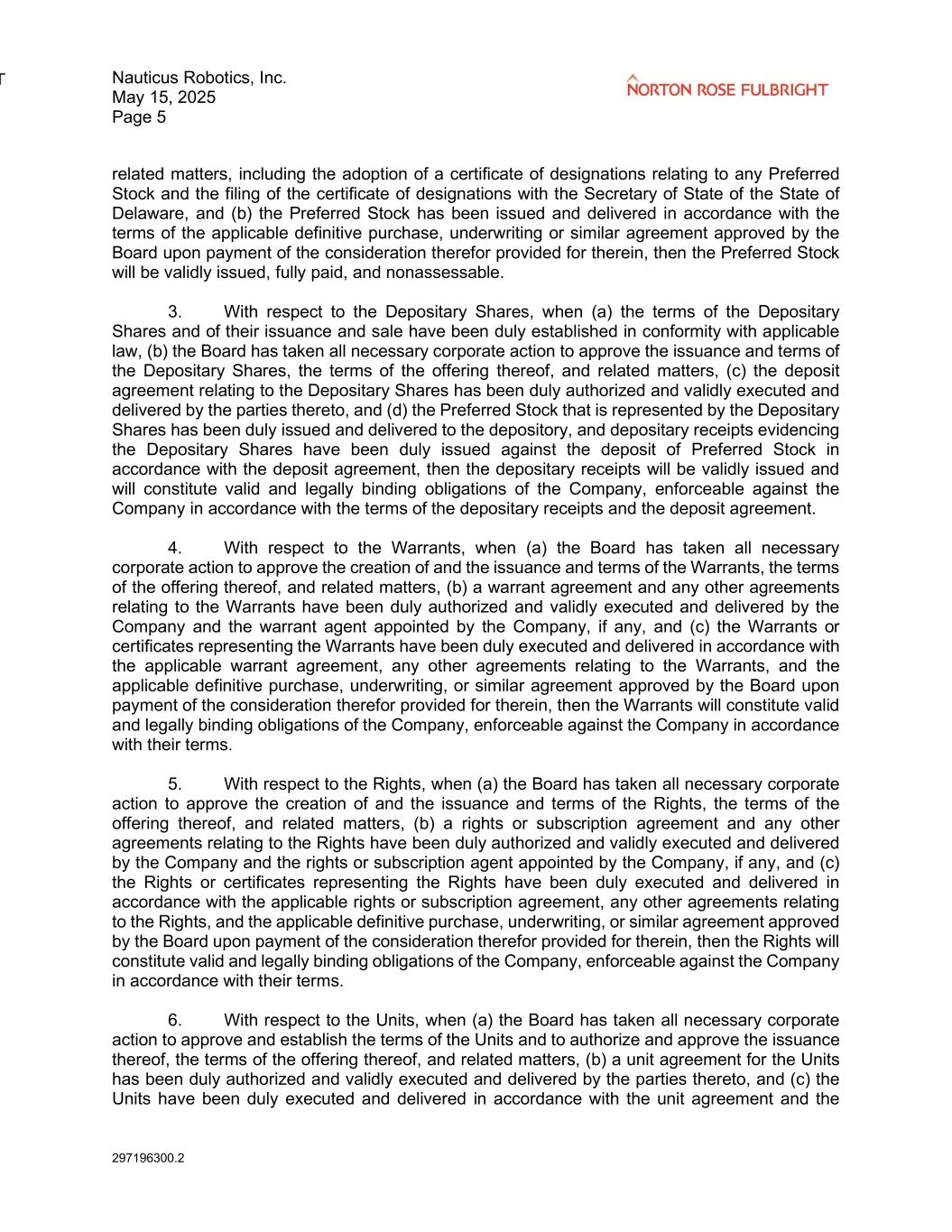 Nauticus Robotics, Inc. May 15, 2025 Page 5 297196300.2 related matters, including the adoption of a certificate of designations relating to any Preferred Stock and the filing of the certificate of designations with the Secretary of State of the State of Delaware, and (b) the Preferred Stock has been issued and delivered in accordance with the terms of the applicable definitive purchase, underwriting or similar agreement approved by the Board upon payment of the consideration therefor provided for therein, then the Preferred Stock will be validly issued, fully paid, and nonassessable. 3. With respect to the Depositary Shares, when (a) the terms of the Depositary Shares and of their issuance and sale have been duly established in conformity with applicable law, (b) the Board has taken all necessary corporate action to approve the issuance and terms of the Depositary Shares, the terms of the offering thereof, and related matters, (c) the deposit agreement relating to the Depositary Shares has been duly authorized and validly executed and delivered by the parties thereto, and (d) the Preferred Stock that is represented by the Depositary Shares has been duly issued and delivered to the depository, and depositary receipts evidencing the Depositary Shares have been duly issued against the deposit of Preferred Stock in accordance with the deposit agreement, then the depositary receipts will be validly issued and will constitute valid and legally binding obligations of the Company, enforceable against the Company in accordance with the terms of the depositary receipts and the deposit agreement. 4. With respect to the Warrants, when (a) the Board has taken all necessary corporate action to approve the creation of and the issuance and terms of the Warrants, the terms of the offering thereof, and related matters, (b) a warrant agreement and any other agreements relating to the Warrants have been duly authorized and validly executed and delivered by the Company and the warrant agent appointed by the Company, if any, and (c) the Warrants or certificates representing the Warrants have been duly executed and delivered in accordance with the applicable warrant agreement, any other agreements relating to the Warrants, and the applicable definitive purchase, underwriting, or similar agreement approved by the Board upon payment of the consideration therefor provided for therein, then the Warrants will constitute valid and legally binding obligations of the Company, enforceable against the Company in accordance with their terms. 5. With respect to the Rights, when (a) the Board has taken all necessary corporate action to approve the creation of and the issuance and terms of the Rights, the terms of the offering thereof, and related matters, (b) a rights or subscription agreement and any other agreements relating to the Rights have been duly authorized and validly executed and delivered by the Company and the rights or subscription agent appointed by the Company, if any, and (c) the Rights or certificates representing the Rights have been duly executed and delivered in accordance with the applicable rights or subscription agreement, any other agreements relating to the Rights, and the applicable definitive purchase, underwriting, or similar agreement approved by the Board upon payment of the consideration therefor provided for therein, then the Rights will constitute valid and legally binding obligations of the Company, enforceable against the Company in accordance with their terms. 6. With respect to the Units, when (a) the Board has taken all necessary corporate action to approve and establish the terms of the Units and to authorize and approve the issuance thereof, the terms of the offering thereof, and related matters, (b) a unit agreement for the Units has been duly authorized and validly executed and delivered by the parties thereto, and (c) the Units have been duly executed and delivered in accordance with the unit agreement and the