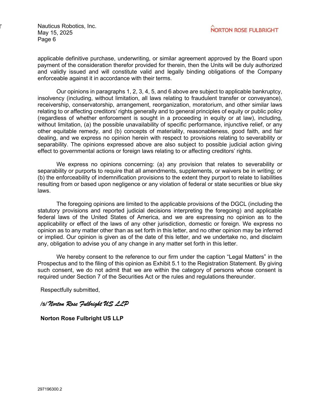 Nauticus Robotics, Inc. May 15, 2025 Page 6 297196300.2 applicable definitive purchase, underwriting, or similar agreement approved by the Board upon payment of the consideration therefor provided for therein, then the Units will be duly authorized and validly issued and will constitute valid and legally binding obligations of the Company enforceable against it in accordance with their terms. Our opinions in paragraphs 1, 2, 3, 4, 5, and 6 above are subject to applicable bankruptcy, insolvency (including, without limitation, all laws relating to fraudulent transfer or conveyance), receivership, conservatorship, arrangement, reorganization, moratorium, and other similar laws relating to or affecting creditors’ rights generally and to general principles of equity or public policy (regardless of whether enforcement is sought in a proceeding in equity or at law), including, without limitation, (a) the possible unavailability of specific performance, injunctive relief, or any other equitable remedy, and (b) concepts of materiality, reasonableness, good faith, and fair dealing, and we express no opinion herein with respect to provisions relating to severability or separability. The opinions expressed above are also subject to possible judicial action giving effect to governmental actions or foreign laws relating to or affecting creditors’ rights. We express no opinions concerning: (a) any provision that relates to severability or separability or purports to require that all amendments, supplements, or waivers be in writing; or (b) the enforceability of indemnification provisions to the extent they purport to relate to liabilities resulting from or based upon negligence or any violation of federal or state securities or blue sky laws. The foregoing opinions are limited to the applicable provisions of the DGCL (including the statutory provisions and reported judicial decisions interpreting the foregoing) and applicable federal laws of the United States of America, and we are expressing no opinion as to the applicability or effect of the laws of any other jurisdiction, domestic or foreign. We express no opinion as to any matter other than as set forth in this letter, and no other opinion may be inferred or implied. Our opinion is given as of the date of this letter, and we undertake no, and disclaim any, obligation to advise you of any change in any matter set forth in this letter. We hereby consent to the reference to our firm under the caption “Legal Matters” in the Prospectus and to the filing of this opinion as Exhibit 5.1 to the Registration Statement. By giving such consent, we do not admit that we are within the category of persons whose consent is required under Section 7 of the Securities Act or the rules and regulations thereunder. Respectfully submitted, /s/ Norton Rose Fulbright US LLP Norton Rose Fulbright US LLP