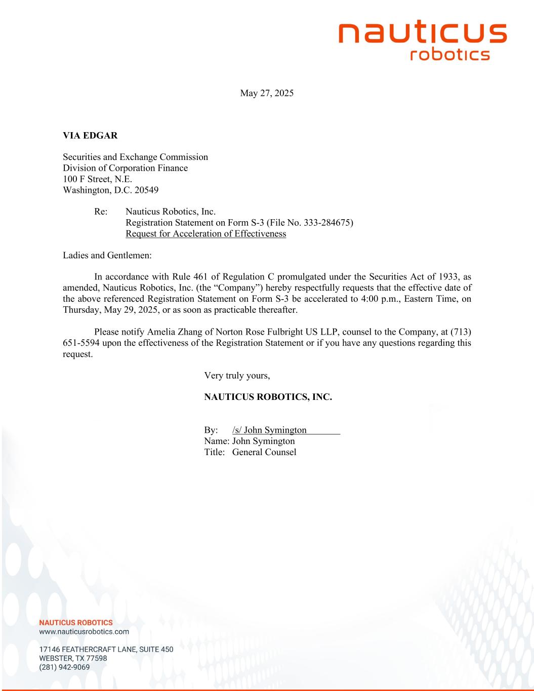 May 27, 2025 VIA EDGAR Securities and Exchange Commission Division of Corporation Finance 100 F Street, N.E. Washington, D.C. 20549 Re: Nauticus Robotics, Inc. Registration Statement on Form S-3 (File No. 333-284675) Request for Acceleration of Effectiveness Ladies and Gentlemen: In accordance with Rule 461 of Regulation C promulgated under the Securities Act of 1933, as amended, Nauticus Robotics, Inc. (the “Company”) hereby respectfully requests that the effective date of the above referenced Registration Statement on Form S-3 be accelerated to 4:00 p.m., Eastern Time, on Thursday, May 29, 2025, or as soon as practicable thereafter. Please notify Amelia Zhang of Norton Rose Fulbright US LLP, counsel to the Company, at (713) 651-5594 upon the effectiveness of the Registration Statement or if you have any questions regarding this request. Very truly yours, NAUTICUS ROBOTICS, INC. By: /s/ John Symington . Name: John Symington Title: General Counsel