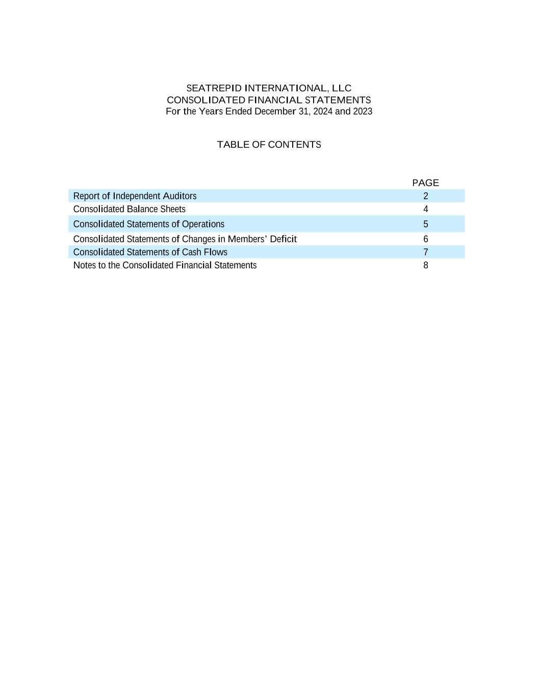 SEATREPID INTERNATIONAL, LLC CONSOLIDATED FINANCIAL STATEMENTS For the Years Ended December 31, 2024 and 2023 TABLE OF CONTENTS PAGE Report of Independent Auditors 2 Consolidated Balance Sheets 4 Consolidated Statements of Operations 5 Consolidated Statements of Changes in Members’ Deficit 6 Consolidated Statements of Cash Flows 7 Notes to the Consolidated Financial Statements 8