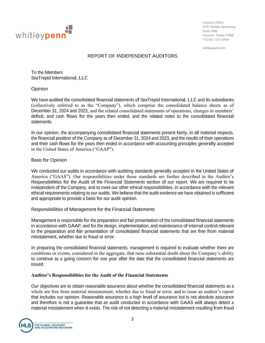 Houston Office 3737 Buffalo Speedway Suite 1600 Houston, Texas 77098 713.621.1515 Main whitleypenn.com 2 REPORT OF INDEPENDENT AUDITORS To the Members SeaTrepid International, LLC Opinion We have audited the consolidated financial statements of SeaTrepid International, LLC and its subsidiaries (collectively referred to as the “Company”), which comprise the consolidated balance sheets as of December 31, 2024 and 2023, and the related consolidated statements of operations, changes in members’ deficit, and cash flows for the years then ended, and the related notes to the consolidated financial statements. In our opinion, the accompanying consolidated financial statements present fairly, in all material respects, the financial position of the Company as of December 31, 2024 and 2023, and the results of their operations and their cash flows for the years then ended in accordance with accounting principles generally accepted in the United States of America (“GAAP”). Basis for Opinion We conducted our audits in accordance with auditing standards generally accepted in the United States of America (“GAAS”). Our responsibilities under those standards are further described in the Auditor’s Responsibilities for the Audit of the Financial Statements section of our report. We are required to be independent of the Company, and to meet our other ethical responsibilities, in accordance with the relevant ethical requirements relating to our audits. We believe that the audit evidence we have obtained is sufficient and appropriate to provide a basis for our audit opinion. Responsibilities of Management for the Financial Statements Management is responsible for the preparation and fair presentation of the consolidated financial statements in accordance with GAAP, and for the design, implementation, and maintenance of internal control relevant to the preparation and fair presentation of consolidated financial statements that are free from material misstatement, whether due to fraud or error. In preparing the consolidated financial statements, management is required to evaluate whether there are conditions or events, considered in the aggregate, that raise substantial doubt about the Company’s ability to continue as a going concern for one year after the date that the consolidated financial statements are issued. Auditor’s Responsibilities for the Audit of the Financial Statements Our objectives are to obtain reasonable assurance about whether the consolidated financial statements as a whole are free from material misstatement, whether due to fraud or error, and to issue an auditor’s report that includes our opinion. Reasonable assurance is a high level of assurance but is not absolute assurance and therefore is not a guarantee that an audit conducted in accordance with GAAS will always detect a material misstatement when it exists. The risk of not detecting a material misstatement resulting from fraud