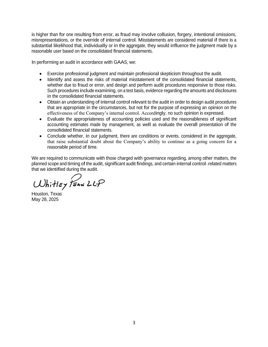 3 is higher than for one resulting from error, as fraud may involve collusion, forgery, intentional omissions, misrepresentations, or the override of internal control. Misstatements are considered material if there is a substantial likelihood that, individually or in the aggregate, they would influence the judgment made by a reasonable user based on the consolidated financial statements. In performing an audit in accordance with GAAS, we: • Exercise professional judgment and maintain professional skepticism throughout the audit. • Identify and assess the risks of material misstatement of the consolidated financial statements, whether due to fraud or error, and design and perform audit procedures responsive to those risks. Such procedures include examining, on a test basis, evidence regarding the amounts and disclosures in the consolidated financial statements. • Obtain an understanding of internal control relevant to the audit in order to design audit procedures that are appropriate in the circumstances, but not for the purpose of expressing an opinion on the effectiveness of the Company’s internal control. Accordingly, no such opinion is expressed. • Evaluate the appropriateness of accounting policies used and the reasonableness of significant accounting estimates made by management, as well as evaluate the overall presentation of the consolidated financial statements. • Conclude whether, in our judgment, there are conditions or events, considered in the aggregate, that raise substantial doubt about the Company’s ability to continue as a going concern for a reasonable period of time. We are required to communicate with those charged with governance regarding, among other matters, the planned scope and timing of the audit, significant audit findings, and certain internal control–related matters that we identified during the audit. Houston, Texas May 28, 2025