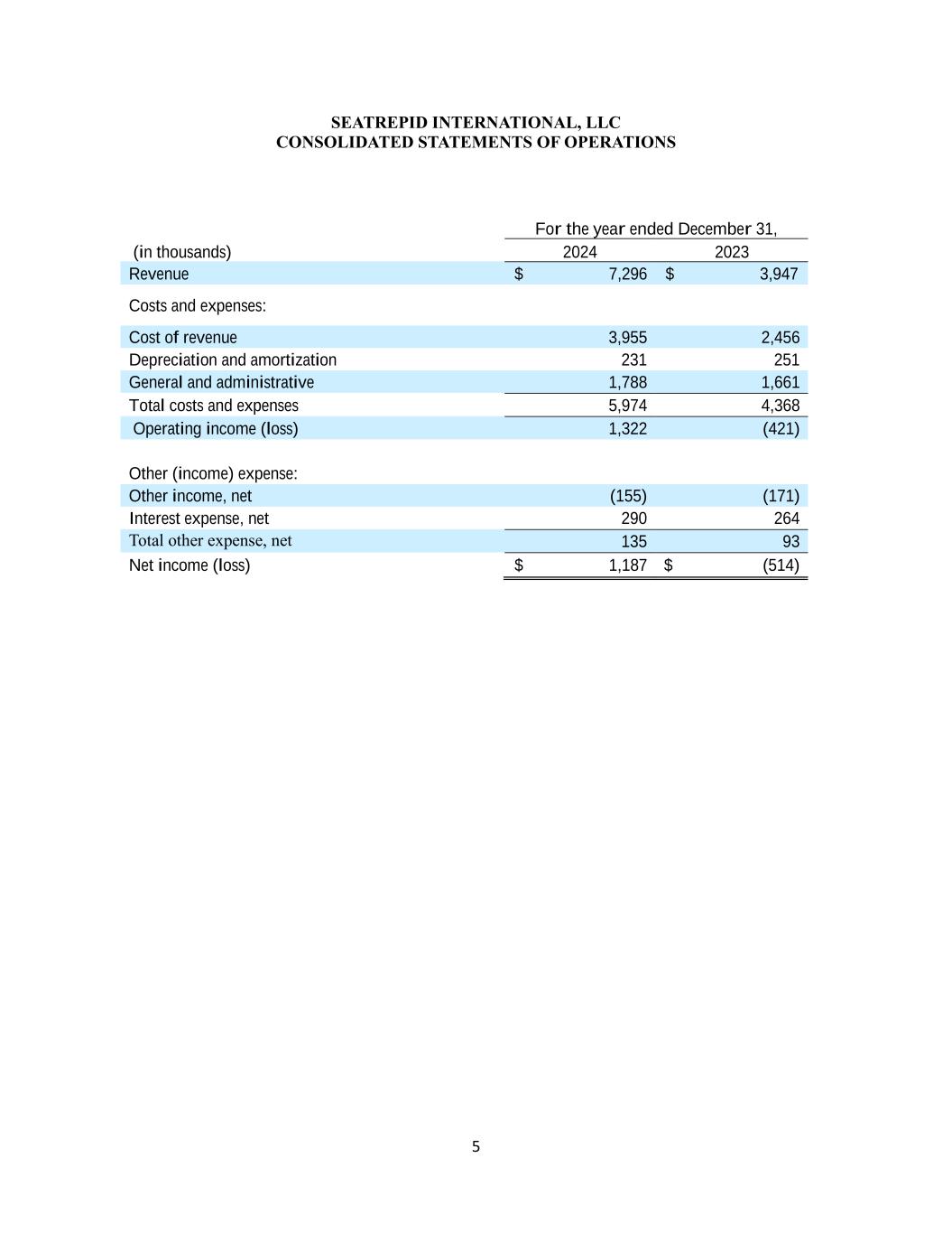 5 SEATREPID INTERNATIONAL, LLC CONSOLIDATED STATEMENTS OF OPERATIONS For the year ended December 31, (in thousands) 2024 2023 Revenue $ 7,296 $ 3,947 Costs and expenses: Cost of revenue 3,955 2,456 Depreciation and amortization 231 251 General and administrative 1,788 1,661 Total costs and expenses 5,974 4,368 Operating income (loss) 1,322 (421) Other (income) expense: Other income, net (155) (171) Interest expense, net 290 264 Total other expense, net 135 93 Net income (loss) $ 1,187 $ (514)