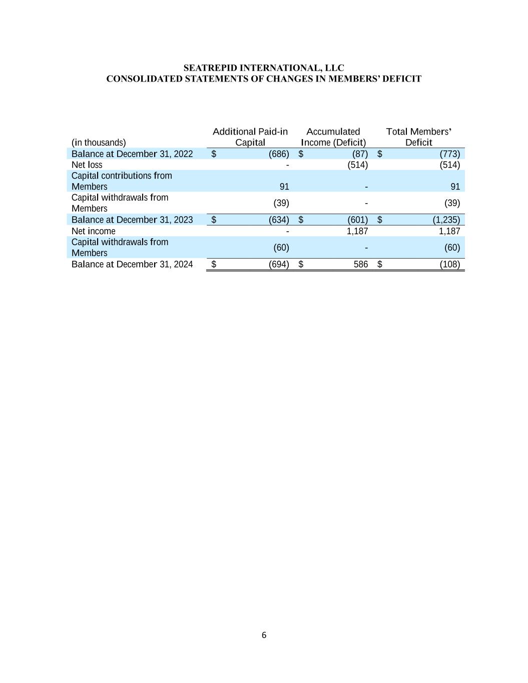 6 SEATREPID INTERNATIONAL, LLC CONSOLIDATED STATEMENTS OF CHANGES IN MEMBERS’ DEFICIT Additional Paid-in Capital Accumulated Income (Deficit) Total Members’ Deficit (in thousands) Balance at December 31, 2022 $ (686) $ (87) $ (773) Net loss - (514) (514) Capital contributions from Members 91 - 91 Capital withdrawals from Members (39) - (39) Balance at December 31, 2023 $ (634) $ (601) $ (1,235) Net income - 1,187 1,187 Capital withdrawals from Members (60) - (60) Balance at December 31, 2024 $ (694) $ 586 $ (108)