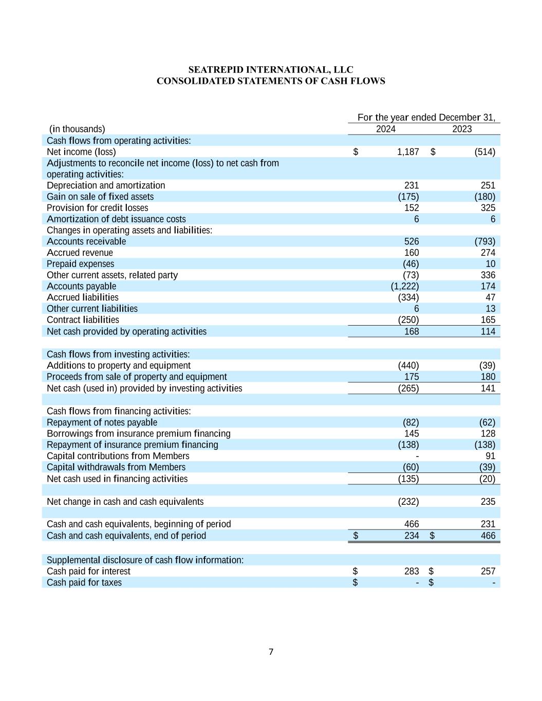 7 SEATREPID INTERNATIONAL, LLC CONSOLIDATED STATEMENTS OF CASH FLOWS For the year ended December 31, (in thousands) 2024 2023 Cash flows from operating activities: Net income (loss) $ 1,187 $ (514) Adjustments to reconcile net income (loss) to net cash from operating activities: Depreciation and amortization 231 251 Gain on sale of fixed assets (175) (180) Provision for credit losses 152 325 Amortization of debt issuance costs 6 6 Changes in operating assets and liabilities: Accounts receivable 526 (793) Accrued revenue 160 274 Prepaid expenses (46) 10 Other current assets, related party (73) 336 Accounts payable (1,222) 174 Accrued liabilities (334) 47 Other current liabilities 6 13 Contract liabilities (250) 165 Net cash provided by operating activities 168 114 Cash flows from investing activities: Additions to property and equipment (440) (39) Proceeds from sale of property and equipment 175 180 Net cash (used in) provided by investing activities (265) 141 Cash flows from financing activities: Repayment of notes payable (82) (62) Borrowings from insurance premium financing 145 128 Repayment of insurance premium financing (138) (138) Capital contributions from Members - 91 Capital withdrawals from Members (60) (39) Net cash used in financing activities (135) (20) Net change in cash and cash equivalents (232) 235 Cash and cash equivalents, beginning of period 466 231 Cash and cash equivalents, end of period $ 234 $ 466 Supplemental disclosure of cash flow information: Cash paid for interest $ 283 $ 257 Cash paid for taxes $ - $ -