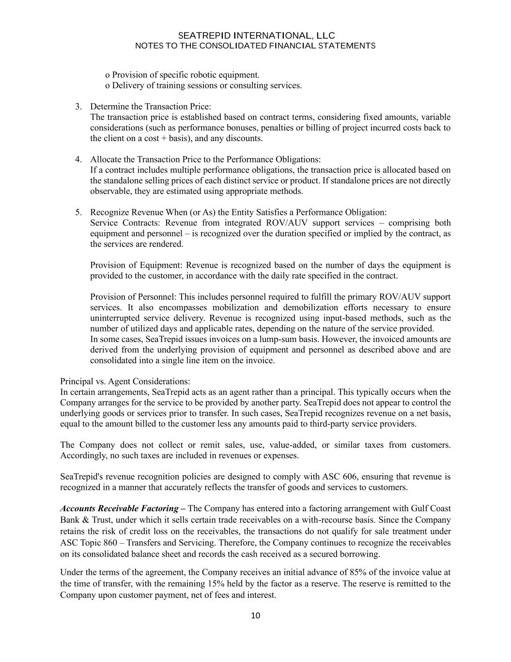 SEATREPID INTERNATIONAL, LLC NOTES TO THE CONSOLIDATED FINANCIAL STATEMENTS 10 o Provision of specific robotic equipment. o Delivery of training sessions or consulting services. 3. Determine the Transaction Price: The transaction price is established based on contract terms, considering fixed amounts, variable considerations (such as performance bonuses, penalties or billing of project incurred costs back to the client on a cost + basis), and any discounts. 4. Allocate the Transaction Price to the Performance Obligations: If a contract includes multiple performance obligations, the transaction price is allocated based on the standalone selling prices of each distinct service or product. If standalone prices are not directly observable, they are estimated using appropriate methods. 5. Recognize Revenue When (or As) the Entity Satisfies a Performance Obligation: Service Contracts: Revenue from integrated ROV/AUV support services – comprising both equipment and personnel – is recognized over the duration specified or implied by the contract, as the services are rendered. Provision of Equipment: Revenue is recognized based on the number of days the equipment is provided to the customer, in accordance with the daily rate specified in the contract. Provision of Personnel: This includes personnel required to fulfill the primary ROV/AUV support services. It also encompasses mobilization and demobilization efforts necessary to ensure uninterrupted service delivery. Revenue is recognized using input-based methods, such as the number of utilized days and applicable rates, depending on the nature of the service provided. In some cases, SeaTrepid issues invoices on a lump-sum basis. However, the invoiced amounts are derived from the underlying provision of equipment and personnel as described above and are consolidated into a single line item on the invoice. Principal vs. Agent Considerations: In certain arrangements, SeaTrepid acts as an agent rather than a principal. This typically occurs when the Company arranges for the service to be provided by another party. SeaTrepid does not appear to control the underlying goods or services prior to transfer. In such cases, SeaTrepid recognizes revenue on a net basis, equal to the amount billed to the customer less any amounts paid to third-party service providers. The Company does not collect or remit sales, use, value-added, or similar taxes from customers. Accordingly, no such taxes are included in revenues or expenses. SeaTrepid's revenue recognition policies are designed to comply with ASC 606, ensuring that revenue is recognized in a manner that accurately reflects the transfer of goods and services to customers. Accounts Receivable Factoring – The Company has entered into a factoring arrangement with Gulf Coast Bank & Trust, under which it sells certain trade receivables on a with-recourse basis. Since the Company retains the risk of credit loss on the receivables, the transactions do not qualify for sale treatment under ASC Topic 860 – Transfers and Servicing. Therefore, the Company continues to recognize the receivables on its consolidated balance sheet and records the cash received as a secured borrowing. Under the terms of the agreement, the Company receives an initial advance of 85% of the invoice value at the time of transfer, with the remaining 15% held by the factor as a reserve. The reserve is remitted to the Company upon customer payment, net of fees and interest.