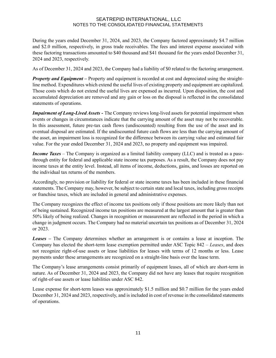 SEATREPID INTERNATIONAL, LLC NOTES TO THE CONSOLIDATED FINANCIAL STATEMENTS 11 During the years ended December 31, 2024, and 2023, the Company factored approximately $4.7 million and $2.0 million, respectively, in gross trade receivables. The fees and interest expense associated with these factoring transactions amounted to $40 thousand and $41 thousand for the years ended December 31, 2024 and 2023, respectively. As of December 31, 2024 and 2023, the Company had a liability of $0 related to the factoring arrangement. Property and Equipment – Property and equipment is recorded at cost and depreciated using the straight- line method. Expenditures which extend the useful lives of existing property and equipment are capitalized. Those costs which do not extend the useful lives are expensed as incurred. Upon disposition, the cost and accumulated depreciation are removed and any gain or loss on the disposal is reflected in the consolidated statements of operations. Impairment of Long-Lived Assets - The Company reviews long-lived assets for potential impairment when events or changes in circumstances indicate that the carrying amount of the asset may not be recoverable. In this assessment, future pre-tax cash flows (undiscounted) resulting from the use of the asset and its eventual disposal are estimated. If the undiscounted future cash flows are less than the carrying amount of the asset, an impairment loss is recognized for the difference between its carrying value and estimated fair value. For the year ended December 31, 2024 and 2023, no property and equipment was impaired. Income Taxes – The Company is organized as a limited liability company (LLC) and is treated as a pass- through entity for federal and applicable state income tax purposes. As a result, the Company does not pay income taxes at the entity level. Instead, all items of income, deductions, gains, and losses are reported on the individual tax returns of the members. Accordingly, no provision or liability for federal or state income taxes has been included in these financial statements. The Company may, however, be subject to certain state and local taxes, including gross receipts or franchise taxes, which are included in general and administrative expenses. The Company recognizes the effect of income tax positions only if those positions are more likely than not of being sustained. Recognized income tax positions are measured at the largest amount that is greater than 50% likely of being realized. Changes in recognition or measurement are reflected in the period in which a change in judgment occurs. The Company had no material uncertain tax positions as of December 31, 2024 or 2023. Leases – The Company determines whether an arrangement is or contains a lease at inception. The Company has elected the short-term lease exemption permitted under ASC Topic 842 – Leases, and does not recognize right-of-use assets or lease liabilities for leases with terms of 12 months or less. Lease payments under these arrangements are recognized on a straight-line basis over the lease term. The Company’s lease arrangements consist primarily of equipment leases, all of which are short-term in nature. As of December 31, 2024 and 2023, the Company did not have any leases that require recognition of right-of-use assets or lease liabilities under ASC 842. Lease expense for short-term leases was approximately $1.5 million and $0.7 million for the years ended December 31, 2024 and 2023, respectively, and is included in cost of revenue in the consolidated statements of operations.