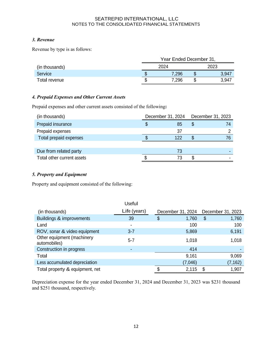 SEATREPID INTERNATIONAL, LLC NOTES TO THE CONSOLIDATED FINANCIAL STATEMENTS 12 3. Revenue Revenue by type is as follows: Year Ended December 31, (in thousands) 2024 2023 Service $ 7,296 $ 3,947 Total revenue $ 7,296 $ 3,947 4. Prepaid Expenses and Other Current Assets Prepaid expenses and other current assets consisted of the following: (in thousands) December 31, 2024 December 31, 2023 Prepaid insurance $ 85 $ 74 Prepaid expenses 37 2 Total prepaid expenses $ 122 $ 76 Due from related party 73 - Total other current assets $ 73 $ - 5. Property and Equipment Property and equipment consisted of the following: (in thousands) Useful December 31, 2024 December 31, 2023 Life (years) Buildings & improvements 39 $ 1,760 $ 1,760 Land - 100 100 ROV, sonar & video equipment 3-7 5,869 6,191 Other equipment (machinery automobiles) 5-7 1,018 1,018 Construction in progress - 414 - Total 9,161 9,069 Less accumulated depreciation (7,046) (7,162) Total property & equipment, net $ 2,115 $ 1,907 Depreciation expense for the year ended December 31, 2024 and December 31, 2023 was $231 thousand and $251 thousand, respectively.