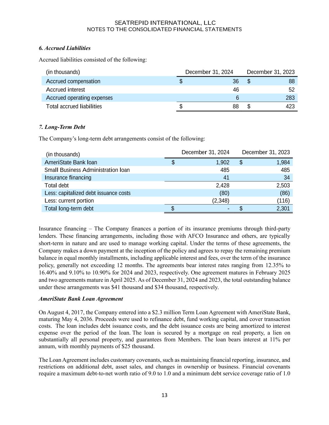 SEATREPID INTERNATIONAL, LLC NOTES TO THE CONSOLIDATED FINANCIAL STATEMENTS 13 6. Accrued Liabilities Accrued liabilities consisted of the following: (in thousands) December 31, 2024 December 31, 2023 Accrued compensation $ 36 $ 88 Accrued interest 46 52 Accrued operating expenses 6 283 Total accrued liabilities $ 88 $ 423 7. Long-Term Debt The Company’s long-term debt arrangements consist of the following: (in thousands) December 31, 2024 December 31, 2023 AmeriState Bank loan $ 1,902 $ 1,984 Small Business Administration loan 485 485 Insurance financing 41 34 Total debt 2,428 2,503 Less: capitalized debt issuance costs (80) (86) Less: current portion (2,348) (116) Total long-term debt $ - $ 2,301 Insurance financing – The Company finances a portion of its insurance premiums through third-party lenders. These financing arrangements, including those with AFCO Insurance and others, are typically short-term in nature and are used to manage working capital. Under the terms of these agreements, the Company makes a down payment at the inception of the policy and agrees to repay the remaining premium balance in equal monthly installments, including applicable interest and fees, over the term of the insurance policy, generally not exceeding 12 months. The agreements bear interest rates ranging from 12.35% to 16.40% and 9.10% to 10.90% for 2024 and 2023, respectively. One agreement matures in February 2025 and two agreements mature in April 2025. As of December 31, 2024 and 2023, the total outstanding balance under these arrangements was $41 thousand and $34 thousand, respectively. AmeriState Bank Loan Agreement On August 4, 2017, the Company entered into a $2.3 million Term Loan Agreement with AmeriState Bank, maturing May 4, 2036. Proceeds were used to refinance debt, fund working capital, and cover transaction costs. The loan includes debt issuance costs, and the debt issuance costs are being amortized to interest expense over the period of the loan. The loan is secured by a mortgage on real property, a lien on substantially all personal property, and guarantees from Members. The loan bears interest at 11% per annum, with monthly payments of $25 thousand. The Loan Agreement includes customary covenants, such as maintaining financial reporting, insurance, and restrictions on additional debt, asset sales, and changes in ownership or business. Financial covenants require a maximum debt-to-net worth ratio of 9.0 to 1.0 and a minimum debt service coverage ratio of 1.0