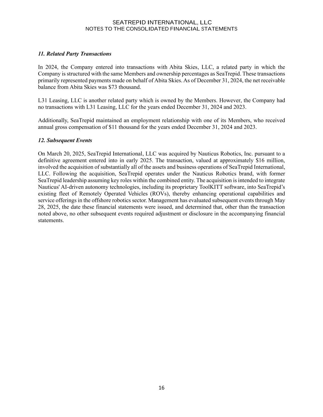 SEATREPID INTERNATIONAL, LLC NOTES TO THE CONSOLIDATED FINANCIAL STATEMENTS 16 11. Related Party Transactions In 2024, the Company entered into transactions with Abita Skies, LLC, a related party in which the Company is structured with the same Members and ownership percentages as SeaTrepid. These transactions primarily represented payments made on behalf of Abita Skies. As of December 31, 2024, the net receivable balance from Abita Skies was $73 thousand. L31 Leasing, LLC is another related party which is owned by the Members. However, the Company had no transactions with L31 Leasing, LLC for the years ended December 31, 2024 and 2023. Additionally, SeaTrepid maintained an employment relationship with one of its Members, who received annual gross compensation of $11 thousand for the years ended December 31, 2024 and 2023. 12. Subsequent Events On March 20, 2025, SeaTrepid International, LLC was acquired by Nauticus Robotics, Inc. pursuant to a definitive agreement entered into in early 2025. The transaction, valued at approximately $16 million, involved the acquisition of substantially all of the assets and business operations of SeaTrepid International, LLC. Following the acquisition, SeaTrepid operates under the Nauticus Robotics brand, with former SeaTrepid leadership assuming key roles within the combined entity. The acquisition is intended to integrate Nauticus' AI-driven autonomy technologies, including its proprietary ToolKITT software, into SeaTrepid’s existing fleet of Remotely Operated Vehicles (ROVs), thereby enhancing operational capabilities and service offerings in the offshore robotics sector. Management has evaluated subsequent events through May 28, 2025, the date these financial statements were issued, and determined that, other than the transaction noted above, no other subsequent events required adjustment or disclosure in the accompanying financial statements.