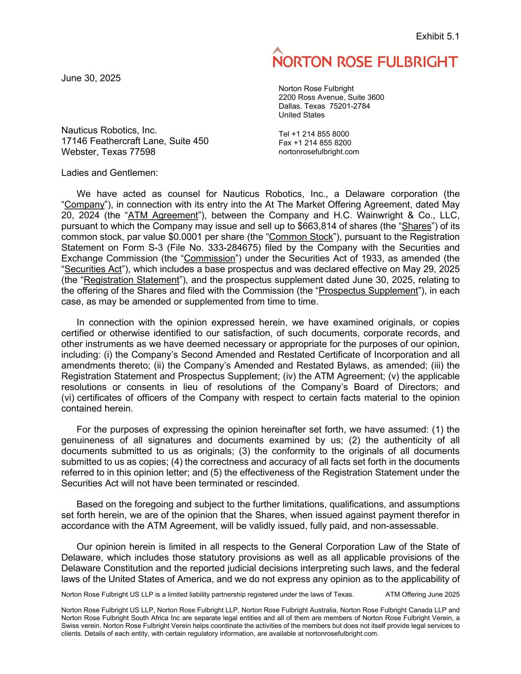 Exhibit 5.1 Norton Rose Fulbright US LLP is a limited liability partnership registered under the laws of Texas. ATM Offering June 2025 Norton Rose Fulbright US LLP, Norton Rose Fulbright LLP, Norton Rose Fulbright Australia, Norton Rose Fulbright Canada LLP and Norton Rose Fulbright South Africa Inc are separate legal entities and all of them are members of Norton Rose Fulbright Verein, a Swiss verein. Norton Rose Fulbright Verein helps coordinate the activities of the members but does not itself provide legal services to clients. Details of each entity, with certain regulatory information, are available at nortonrosefulbright.com. Norton Rose Fulbright 2200 Ross Avenue, Suite 3600 Dallas, Texas 75201-2784 United States Tel +1 214 855 8000 Fax +1 214 855 8200 nortonrosefulbright.com June 30, 2025 Nauticus Robotics, Inc. 17146 Feathercraft Lane, Suite 450 Webster, Texas 77598 Ladies and Gentlemen: We have acted as counsel for Nauticus Robotics, Inc., a Delaware corporation (the “Company”), in connection with its entry into the At The Market Offering Agreement, dated May 20, 2024 (the “ATM Agreement”), between the Company and H.C. Wainwright & Co., LLC, pursuant to which the Company may issue and sell up to $663,814 of shares (the “Shares”) of its common stock, par value $0.0001 per share (the “Common Stock”), pursuant to the Registration Statement on Form S-3 (File No. 333-284675) filed by the Company with the Securities and Exchange Commission (the “Commission”) under the Securities Act of 1933, as amended (the “Securities Act”), which includes a base prospectus and was declared effective on May 29, 2025 (the “Registration Statement”), and the prospectus supplement dated June 30, 2025, relating to the offering of the Shares and filed with the Commission (the “Prospectus Supplement”), in each case, as may be amended or supplemented from time to time. In connection with the opinion expressed herein, we have examined originals, or copies certified or otherwise identified to our satisfaction, of such documents, corporate records, and other instruments as we have deemed necessary or appropriate for the purposes of our opinion, including: (i) the Company’s Second Amended and Restated Certificate of Incorporation and all amendments thereto; (ii) the Company’s Amended and Restated Bylaws, as amended; (iii) the Registration Statement and Prospectus Supplement; (iv) the ATM Agreement; (v) the applicable resolutions or consents in lieu of resolutions of the Company’s Board of Directors; and (vi) certificates of officers of the Company with respect to certain facts material to the opinion contained herein. For the purposes of expressing the opinion hereinafter set forth, we have assumed: (1) the genuineness of all signatures and documents examined by us; (2) the authenticity of all documents submitted to us as originals; (3) the conformity to the originals of all documents submitted to us as copies; (4) the correctness and accuracy of all facts set forth in the documents referred to in this opinion letter; and (5) the effectiveness of the Registration Statement under the Securities Act will not have been terminated or rescinded. Based on the foregoing and subject to the further limitations, qualifications, and assumptions set forth herein, we are of the opinion that the Shares, when issued against payment therefor in accordance with the ATM Agreement, will be validly issued, fully paid, and non-assessable. Our opinion herein is limited in all respects to the General Corporation Law of the State of Delaware, which includes those statutory provisions as well as all applicable provisions of the Delaware Constitution and the reported judicial decisions interpreting such laws, and the federal laws of the United States of America, and we do not express any opinion as to the applicability of