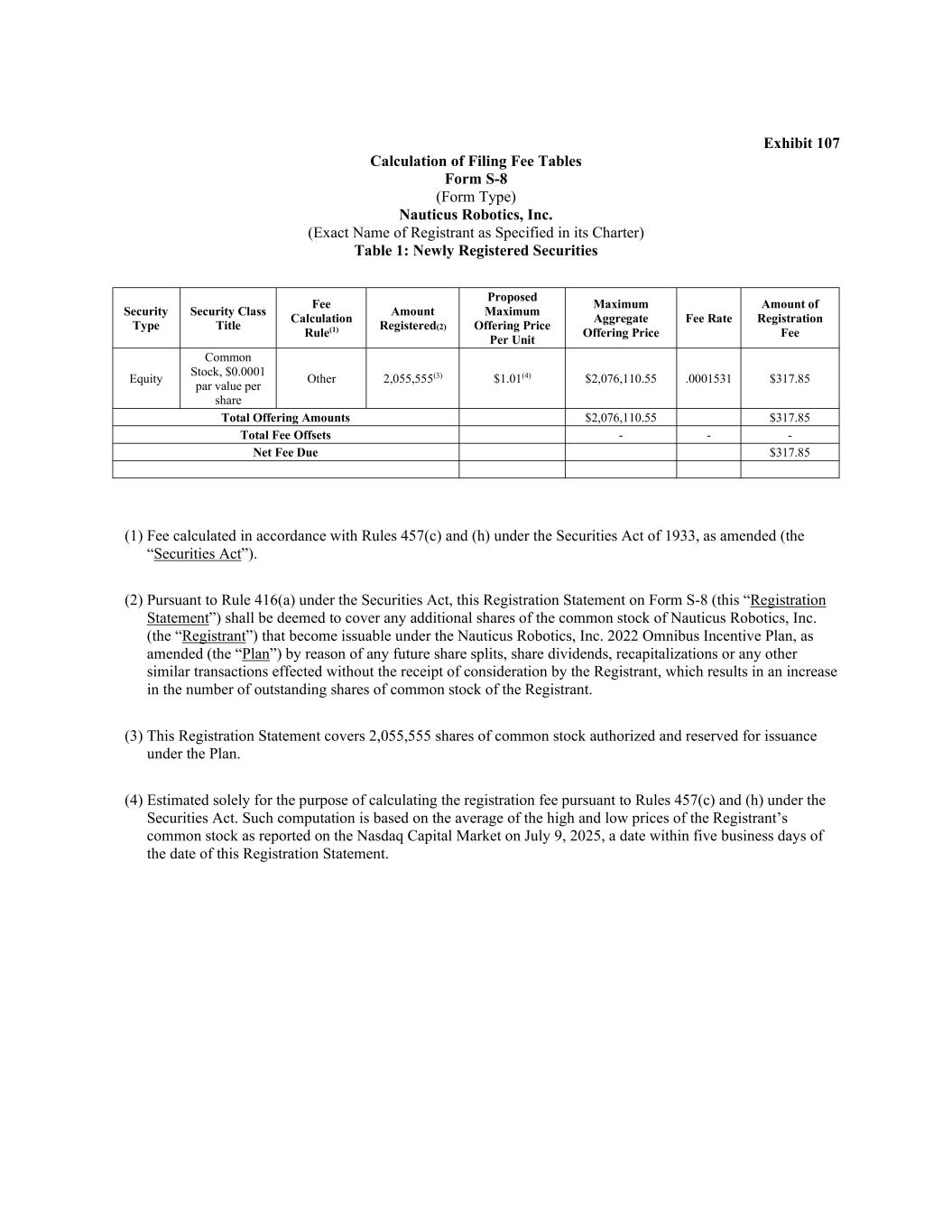Exhibit 107 Calculation of Filing Fee Tables Form S-8 (Form Type) Nauticus Robotics, Inc. (Exact Name of Registrant as Specified in its Charter) Table 1: Newly Registered Securities Security Type Security Class Title Fee Calculation Rule(1) Amount Registered(2) Proposed Maximum Offering Price Per Unit Maximum Aggregate Offering Price Fee Rate Amount of Registration Fee Equity Common Stock, $0.0001 par value per share Other 2,055,555(3) $1.01(4) $2,076,110.55 .0001531 $317.85 Total Offering Amounts $2,076,110.55 $317.85 Total Fee Offsets - - - Net Fee Due $317.85 (1) Fee calculated in accordance with Rules 457(c) and (h) under the Securities Act of 1933, as amended (the “Securities Act”). (2) Pursuant to Rule 416(a) under the Securities Act, this Registration Statement on Form S-8 (this “Registration Statement”) shall be deemed to cover any additional shares of the common stock of Nauticus Robotics, Inc. (the “Registrant”) that become issuable under the Nauticus Robotics, Inc. 2022 Omnibus Incentive Plan, as amended (the “Plan”) by reason of any future share splits, share dividends, recapitalizations or any other similar transactions effected without the receipt of consideration by the Registrant, which results in an increase in the number of outstanding shares of common stock of the Registrant. (3) This Registration Statement covers 2,055,555 shares of common stock authorized and reserved for issuance under the Plan. (4) Estimated solely for the purpose of calculating the registration fee pursuant to Rules 457(c) and (h) under the Securities Act. Such computation is based on the average of the high and low prices of the Registrant’s common stock as reported on the Nasdaq Capital Market on July 9, 2025, a date within five business days of the date of this Registration Statement.