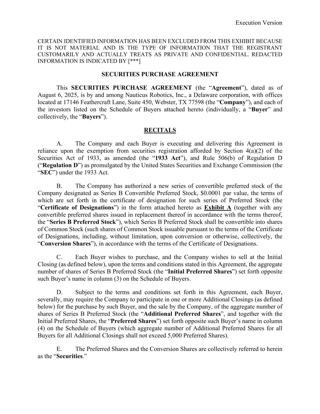 Execution Version CERTAIN IDENTIFIED INFORMATION HAS BEEN EXCLUDED FROM THIS EXHIBIT BECAUSE IT IS NOT MATERIAL AND IS THE TYPE OF INFORMATION THAT THE REGISTRANT CUSTOMARILY AND ACTUALLY TREATS AS PRIVATE AND CONFIDENTIAL. REDACTED INFORMATION IS INDICATED BY [***] SECURITIES PURCHASE AGREEMENT This SECURITIES PURCHASE AGREEMENT (the “Agreement”), dated as of August 6, 2025, is by and among Nauticus Robotics, Inc., a Delaware corporation, with offices located at 17146 Feathercraft Lane, Suite 450, Webster, TX 77598 (the “Company”), and each of the investors listed on the Schedule of Buyers attached hereto (individually, a “Buyer” and collectively, the “Buyers”). RECITALS A. The Company and each Buyer is executing and delivering this Agreement in reliance upon the exemption from securities registration afforded by Section 4(a)(2) of the Securities Act of 1933, as amended (the “1933 Act”), and Rule 506(b) of Regulation D (“Regulation D”) as promulgated by the United States Securities and Exchange Commission (the “SEC”) under the 1933 Act. B. The Company has authorized a new series of convertible preferred stock of the Company designated as Series B Convertible Preferred Stock, $0.0001 par value, the terms of which are set forth in the certificate of designation for such series of Preferred Stock (the “Certificate of Designations”) in the form attached hereto as Exhibit A (together with any convertible preferred shares issued in replacement thereof in accordance with the terms thereof, the “Series B Preferred Stock”), which Series B Preferred Stock shall be convertible into shares of Common Stock (such shares of Common Stock issuable pursuant to the terms of the Certificate of Designations, including, without limitation, upon conversion or otherwise, collectively, the “Conversion Shares”), in accordance with the terms of the Certificate of Designations. C. Each Buyer wishes to purchase, and the Company wishes to sell at the Initial Closing (as defined below), upon the terms and conditions stated in this Agreement, the aggregate number of shares of Series B Preferred Stock (the “Initial Preferred Shares”) set forth opposite such Buyer’s name in column (3) on the Schedule of Buyers. D. Subject to the terms and conditions set forth in this Agreement, each Buyer, severally, may require the Company to participate in one or more Additional Closings (as defined below) for the purchase by such Buyer, and the sale by the Company, of the aggregate number of shares of Series B Preferred Stock (the “Additional Preferred Shares”, and together with the Initial Preferred Shares, the “Preferred Shares”) set forth opposite such Buyer’s name in column (4) on the Schedule of Buyers (which aggregate number of Additional Preferred Shares for all Buyers for all Additional Closings shall not exceed 5,000 Preferred Shares). E. The Preferred Shares and the Conversion Shares are collectively referred to herein as the “Securities.”