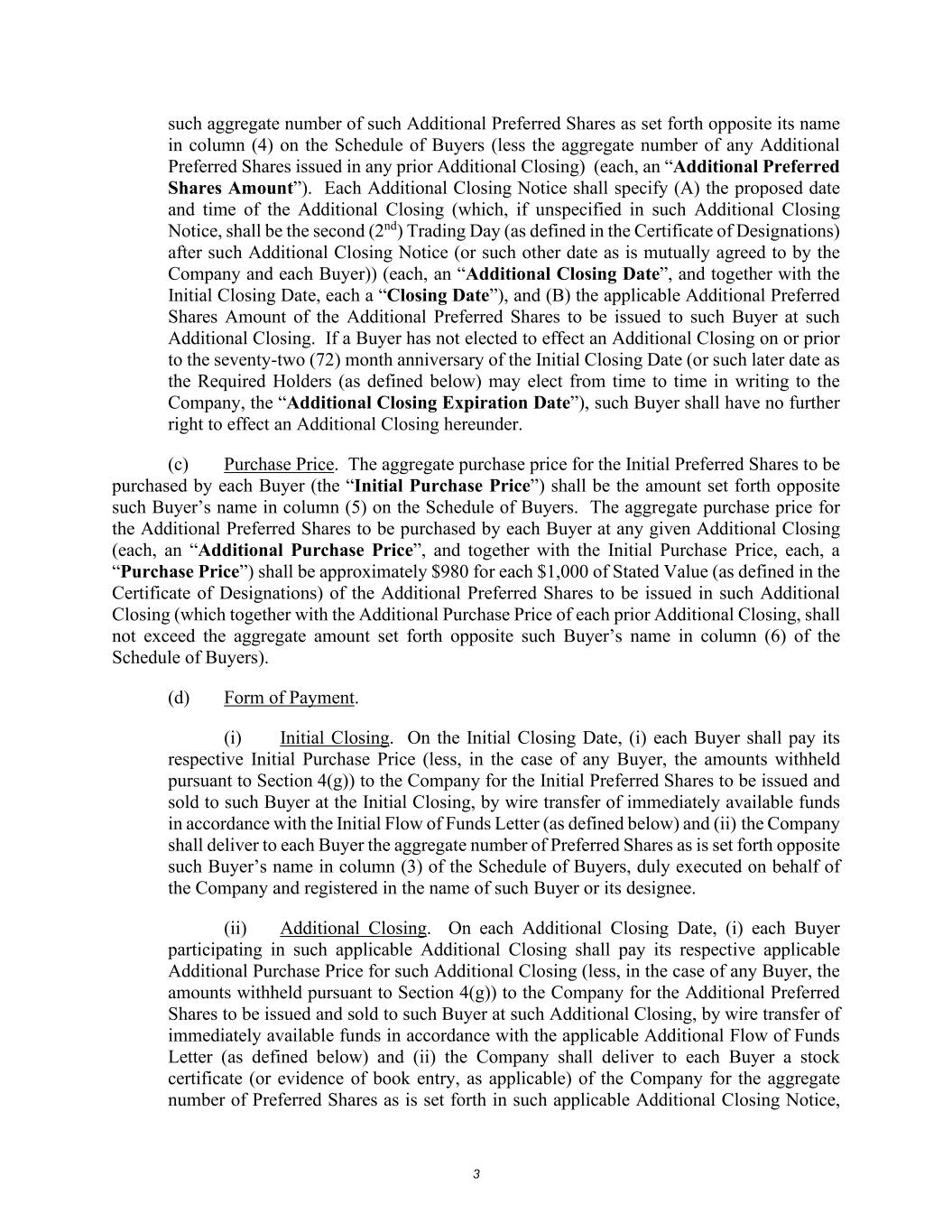 3 such aggregate number of such Additional Preferred Shares as set forth opposite its name in column (4) on the Schedule of Buyers (less the aggregate number of any Additional Preferred Shares issued in any prior Additional Closing) (each, an “Additional Preferred Shares Amount”). Each Additional Closing Notice shall specify (A) the proposed date and time of the Additional Closing (which, if unspecified in such Additional Closing Notice, shall be the second (2nd) Trading Day (as defined in the Certificate of Designations) after such Additional Closing Notice (or such other date as is mutually agreed to by the Company and each Buyer)) (each, an “Additional Closing Date”, and together with the Initial Closing Date, each a “Closing Date”), and (B) the applicable Additional Preferred Shares Amount of the Additional Preferred Shares to be issued to such Buyer at such Additional Closing. If a Buyer has not elected to effect an Additional Closing on or prior to the seventy-two (72) month anniversary of the Initial Closing Date (or such later date as the Required Holders (as defined below) may elect from time to time in writing to the Company, the “Additional Closing Expiration Date”), such Buyer shall have no further right to effect an Additional Closing hereunder. (c) Purchase Price. The aggregate purchase price for the Initial Preferred Shares to be purchased by each Buyer (the “Initial Purchase Price”) shall be the amount set forth opposite such Buyer’s name in column (5) on the Schedule of Buyers. The aggregate purchase price for the Additional Preferred Shares to be purchased by each Buyer at any given Additional Closing (each, an “Additional Purchase Price”, and together with the Initial Purchase Price, each, a “Purchase Price”) shall be approximately $980 for each $1,000 of Stated Value (as defined in the Certificate of Designations) of the Additional Preferred Shares to be issued in such Additional Closing (which together with the Additional Purchase Price of each prior Additional Closing, shall not exceed the aggregate amount set forth opposite such Buyer’s name in column (6) of the Schedule of Buyers). (d) Form of Payment. (i) Initial Closing. On the Initial Closing Date, (i) each Buyer shall pay its respective Initial Purchase Price (less, in the case of any Buyer, the amounts withheld pursuant to Section 4(g)) to the Company for the Initial Preferred Shares to be issued and sold to such Buyer at the Initial Closing, by wire transfer of immediately available funds in accordance with the Initial Flow of Funds Letter (as defined below) and (ii) the Company shall deliver to each Buyer the aggregate number of Preferred Shares as is set forth opposite such Buyer’s name in column (3) of the Schedule of Buyers, duly executed on behalf of the Company and registered in the name of such Buyer or its designee. (ii) Additional Closing. On each Additional Closing Date, (i) each Buyer participating in such applicable Additional Closing shall pay its respective applicable Additional Purchase Price for such Additional Closing (less, in the case of any Buyer, the amounts withheld pursuant to Section 4(g)) to the Company for the Additional Preferred Shares to be issued and sold to such Buyer at such Additional Closing, by wire transfer of immediately available funds in accordance with the applicable Additional Flow of Funds Letter (as defined below) and (ii) the Company shall deliver to each Buyer a stock certificate (or evidence of book entry, as applicable) of the Company for the aggregate number of Preferred Shares as is set forth in such applicable Additional Closing Notice,