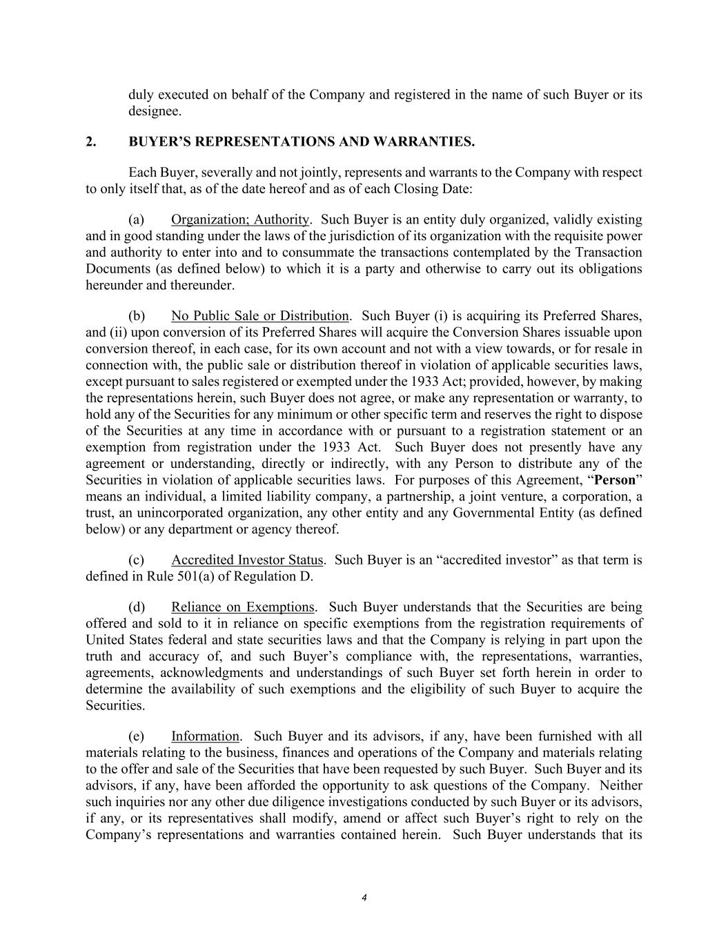 4 duly executed on behalf of the Company and registered in the name of such Buyer or its designee. 2. BUYER’S REPRESENTATIONS AND WARRANTIES. Each Buyer, severally and not jointly, represents and warrants to the Company with respect to only itself that, as of the date hereof and as of each Closing Date: (a) Organization; Authority. Such Buyer is an entity duly organized, validly existing and in good standing under the laws of the jurisdiction of its organization with the requisite power and authority to enter into and to consummate the transactions contemplated by the Transaction Documents (as defined below) to which it is a party and otherwise to carry out its obligations hereunder and thereunder. (b) No Public Sale or Distribution. Such Buyer (i) is acquiring its Preferred Shares, and (ii) upon conversion of its Preferred Shares will acquire the Conversion Shares issuable upon conversion thereof, in each case, for its own account and not with a view towards, or for resale in connection with, the public sale or distribution thereof in violation of applicable securities laws, except pursuant to sales registered or exempted under the 1933 Act; provided, however, by making the representations herein, such Buyer does not agree, or make any representation or warranty, to hold any of the Securities for any minimum or other specific term and reserves the right to dispose of the Securities at any time in accordance with or pursuant to a registration statement or an exemption from registration under the 1933 Act. Such Buyer does not presently have any agreement or understanding, directly or indirectly, with any Person to distribute any of the Securities in violation of applicable securities laws. For purposes of this Agreement, “Person” means an individual, a limited liability company, a partnership, a joint venture, a corporation, a trust, an unincorporated organization, any other entity and any Governmental Entity (as defined below) or any department or agency thereof. (c) Accredited Investor Status. Such Buyer is an “accredited investor” as that term is defined in Rule 501(a) of Regulation D. (d) Reliance on Exemptions. Such Buyer understands that the Securities are being offered and sold to it in reliance on specific exemptions from the registration requirements of United States federal and state securities laws and that the Company is relying in part upon the truth and accuracy of, and such Buyer’s compliance with, the representations, warranties, agreements, acknowledgments and understandings of such Buyer set forth herein in order to determine the availability of such exemptions and the eligibility of such Buyer to acquire the Securities. (e) Information. Such Buyer and its advisors, if any, have been furnished with all materials relating to the business, finances and operations of the Company and materials relating to the offer and sale of the Securities that have been requested by such Buyer. Such Buyer and its advisors, if any, have been afforded the opportunity to ask questions of the Company. Neither such inquiries nor any other due diligence investigations conducted by such Buyer or its advisors, if any, or its representatives shall modify, amend or affect such Buyer’s right to rely on the Company’s representations and warranties contained herein. Such Buyer understands that its