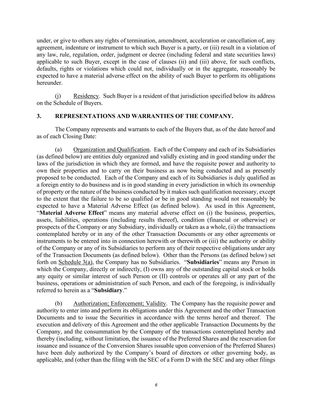 6 under, or give to others any rights of termination, amendment, acceleration or cancellation of, any agreement, indenture or instrument to which such Buyer is a party, or (iii) result in a violation of any law, rule, regulation, order, judgment or decree (including federal and state securities laws) applicable to such Buyer, except in the case of clauses (ii) and (iii) above, for such conflicts, defaults, rights or violations which could not, individually or in the aggregate, reasonably be expected to have a material adverse effect on the ability of such Buyer to perform its obligations hereunder. (j) Residency. Such Buyer is a resident of that jurisdiction specified below its address on the Schedule of Buyers. 3. REPRESENTATIONS AND WARRANTIES OF THE COMPANY. The Company represents and warrants to each of the Buyers that, as of the date hereof and as of each Closing Date: (a) Organization and Qualification. Each of the Company and each of its Subsidiaries (as defined below) are entities duly organized and validly existing and in good standing under the laws of the jurisdiction in which they are formed, and have the requisite power and authority to own their properties and to carry on their business as now being conducted and as presently proposed to be conducted. Each of the Company and each of its Subsidiaries is duly qualified as a foreign entity to do business and is in good standing in every jurisdiction in which its ownership of property or the nature of the business conducted by it makes such qualification necessary, except to the extent that the failure to be so qualified or be in good standing would not reasonably be expected to have a Material Adverse Effect (as defined below). As used in this Agreement, “Material Adverse Effect” means any material adverse effect on (i) the business, properties, assets, liabilities, operations (including results thereof), condition (financial or otherwise) or prospects of the Company or any Subsidiary, individually or taken as a whole, (ii) the transactions contemplated hereby or in any of the other Transaction Documents or any other agreements or instruments to be entered into in connection herewith or therewith or (iii) the authority or ability of the Company or any of its Subsidiaries to perform any of their respective obligations under any of the Transaction Documents (as defined below). Other than the Persons (as defined below) set forth on Schedule 3(a), the Company has no Subsidiaries. “Subsidiaries” means any Person in which the Company, directly or indirectly, (I) owns any of the outstanding capital stock or holds any equity or similar interest of such Person or (II) controls or operates all or any part of the business, operations or administration of such Person, and each of the foregoing, is individually referred to herein as a “Subsidiary.” (b) Authorization; Enforcement; Validity. The Company has the requisite power and authority to enter into and perform its obligations under this Agreement and the other Transaction Documents and to issue the Securities in accordance with the terms hereof and thereof. The execution and delivery of this Agreement and the other applicable Transaction Documents by the Company, and the consummation by the Company of the transactions contemplated hereby and thereby (including, without limitation, the issuance of the Preferred Shares and the reservation for issuance and issuance of the Conversion Shares issuable upon conversion of the Preferred Shares) have been duly authorized by the Company’s board of directors or other governing body, as applicable, and (other than the filing with the SEC of a Form D with the SEC and any other filings