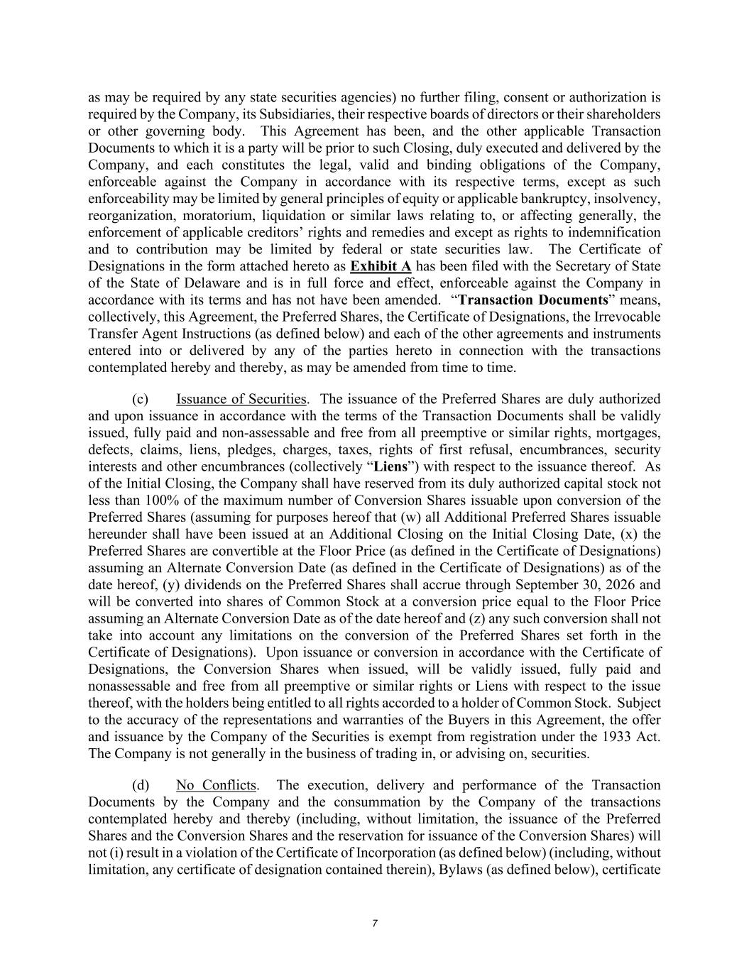 7 as may be required by any state securities agencies) no further filing, consent or authorization is required by the Company, its Subsidiaries, their respective boards of directors or their shareholders or other governing body. This Agreement has been, and the other applicable Transaction Documents to which it is a party will be prior to such Closing, duly executed and delivered by the Company, and each constitutes the legal, valid and binding obligations of the Company, enforceable against the Company in accordance with its respective terms, except as such enforceability may be limited by general principles of equity or applicable bankruptcy, insolvency, reorganization, moratorium, liquidation or similar laws relating to, or affecting generally, the enforcement of applicable creditors’ rights and remedies and except as rights to indemnification and to contribution may be limited by federal or state securities law. The Certificate of Designations in the form attached hereto as Exhibit A has been filed with the Secretary of State of the State of Delaware and is in full force and effect, enforceable against the Company in accordance with its terms and has not have been amended. “Transaction Documents” means, collectively, this Agreement, the Preferred Shares, the Certificate of Designations, the Irrevocable Transfer Agent Instructions (as defined below) and each of the other agreements and instruments entered into or delivered by any of the parties hereto in connection with the transactions contemplated hereby and thereby, as may be amended from time to time. (c) Issuance of Securities. The issuance of the Preferred Shares are duly authorized and upon issuance in accordance with the terms of the Transaction Documents shall be validly issued, fully paid and non-assessable and free from all preemptive or similar rights, mortgages, defects, claims, liens, pledges, charges, taxes, rights of first refusal, encumbrances, security interests and other encumbrances (collectively “Liens”) with respect to the issuance thereof. As of the Initial Closing, the Company shall have reserved from its duly authorized capital stock not less than 100% of the maximum number of Conversion Shares issuable upon conversion of the Preferred Shares (assuming for purposes hereof that (w) all Additional Preferred Shares issuable hereunder shall have been issued at an Additional Closing on the Initial Closing Date, (x) the Preferred Shares are convertible at the Floor Price (as defined in the Certificate of Designations) assuming an Alternate Conversion Date (as defined in the Certificate of Designations) as of the date hereof, (y) dividends on the Preferred Shares shall accrue through September 30, 2026 and will be converted into shares of Common Stock at a conversion price equal to the Floor Price assuming an Alternate Conversion Date as of the date hereof and (z) any such conversion shall not take into account any limitations on the conversion of the Preferred Shares set forth in the Certificate of Designations). Upon issuance or conversion in accordance with the Certificate of Designations, the Conversion Shares when issued, will be validly issued, fully paid and nonassessable and free from all preemptive or similar rights or Liens with respect to the issue thereof, with the holders being entitled to all rights accorded to a holder of Common Stock. Subject to the accuracy of the representations and warranties of the Buyers in this Agreement, the offer and issuance by the Company of the Securities is exempt from registration under the 1933 Act. The Company is not generally in the business of trading in, or advising on, securities. (d) No Conflicts. The execution, delivery and performance of the Transaction Documents by the Company and the consummation by the Company of the transactions contemplated hereby and thereby (including, without limitation, the issuance of the Preferred Shares and the Conversion Shares and the reservation for issuance of the Conversion Shares) will not (i) result in a violation of the Certificate of Incorporation (as defined below) (including, without limitation, any certificate of designation contained therein), Bylaws (as defined below), certificate