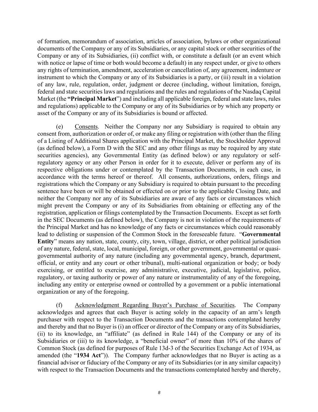 8 of formation, memorandum of association, articles of association, bylaws or other organizational documents of the Company or any of its Subsidiaries, or any capital stock or other securities of the Company or any of its Subsidiaries, (ii) conflict with, or constitute a default (or an event which with notice or lapse of time or both would become a default) in any respect under, or give to others any rights of termination, amendment, acceleration or cancellation of, any agreement, indenture or instrument to which the Company or any of its Subsidiaries is a party, or (iii) result in a violation of any law, rule, regulation, order, judgment or decree (including, without limitation, foreign, federal and state securities laws and regulations and the rules and regulations of the Nasdaq Capital Market (the “Principal Market”) and including all applicable foreign, federal and state laws, rules and regulations) applicable to the Company or any of its Subsidiaries or by which any property or asset of the Company or any of its Subsidiaries is bound or affected. (e) Consents. Neither the Company nor any Subsidiary is required to obtain any consent from, authorization or order of, or make any filing or registration with (other than the filing of a Listing of Additional Shares application with the Principal Market, the Stockholder Approval (as defined below), a Form D with the SEC and any other filings as may be required by any state securities agencies), any Governmental Entity (as defined below) or any regulatory or self- regulatory agency or any other Person in order for it to execute, deliver or perform any of its respective obligations under or contemplated by the Transaction Documents, in each case, in accordance with the terms hereof or thereof. All consents, authorizations, orders, filings and registrations which the Company or any Subsidiary is required to obtain pursuant to the preceding sentence have been or will be obtained or effected on or prior to the applicable Closing Date, and neither the Company nor any of its Subsidiaries are aware of any facts or circumstances which might prevent the Company or any of its Subsidiaries from obtaining or effecting any of the registration, application or filings contemplated by the Transaction Documents. Except as set forth in the SEC Documents (as defined below), the Company is not in violation of the requirements of the Principal Market and has no knowledge of any facts or circumstances which could reasonably lead to delisting or suspension of the Common Stock in the foreseeable future. “Governmental Entity” means any nation, state, county, city, town, village, district, or other political jurisdiction of any nature, federal, state, local, municipal, foreign, or other government, governmental or quasi- governmental authority of any nature (including any governmental agency, branch, department, official, or entity and any court or other tribunal), multi-national organization or body; or body exercising, or entitled to exercise, any administrative, executive, judicial, legislative, police, regulatory, or taxing authority or power of any nature or instrumentality of any of the foregoing, including any entity or enterprise owned or controlled by a government or a public international organization or any of the foregoing. (f) Acknowledgment Regarding Buyer’s Purchase of Securities. The Company acknowledges and agrees that each Buyer is acting solely in the capacity of an arm’s length purchaser with respect to the Transaction Documents and the transactions contemplated hereby and thereby and that no Buyer is (i) an officer or director of the Company or any of its Subsidiaries, (ii) to its knowledge, an “affiliate” (as defined in Rule 144) of the Company or any of its Subsidiaries or (iii) to its knowledge, a “beneficial owner” of more than 10% of the shares of Common Stock (as defined for purposes of Rule 13d-3 of the Securities Exchange Act of 1934, as amended (the “1934 Act”)). The Company further acknowledges that no Buyer is acting as a financial advisor or fiduciary of the Company or any of its Subsidiaries (or in any similar capacity) with respect to the Transaction Documents and the transactions contemplated hereby and thereby,