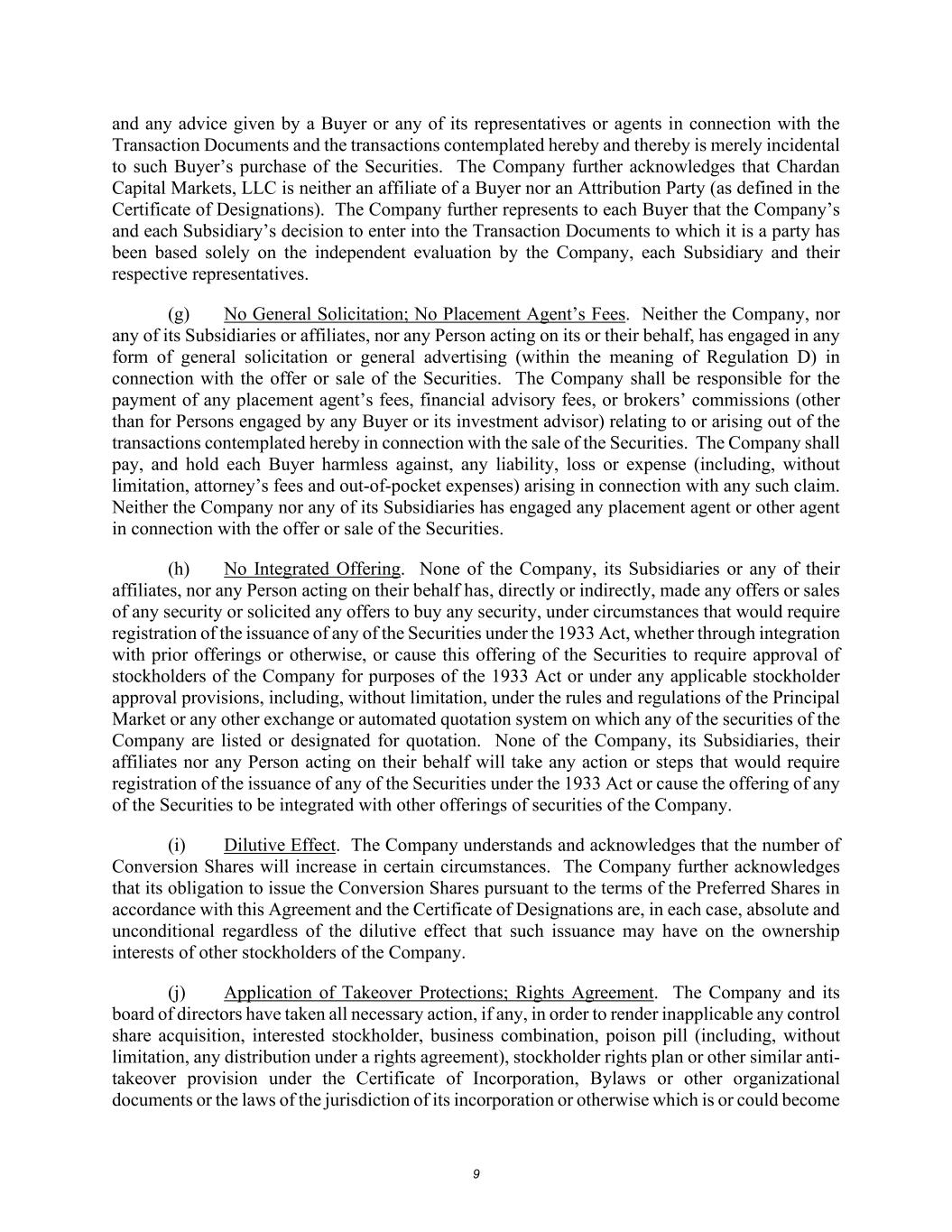 9 and any advice given by a Buyer or any of its representatives or agents in connection with the Transaction Documents and the transactions contemplated hereby and thereby is merely incidental to such Buyer’s purchase of the Securities. The Company further acknowledges that Chardan Capital Markets, LLC is neither an affiliate of a Buyer nor an Attribution Party (as defined in the Certificate of Designations). The Company further represents to each Buyer that the Company’s and each Subsidiary’s decision to enter into the Transaction Documents to which it is a party has been based solely on the independent evaluation by the Company, each Subsidiary and their respective representatives. (g) No General Solicitation; No Placement Agent’s Fees. Neither the Company, nor any of its Subsidiaries or affiliates, nor any Person acting on its or their behalf, has engaged in any form of general solicitation or general advertising (within the meaning of Regulation D) in connection with the offer or sale of the Securities. The Company shall be responsible for the payment of any placement agent’s fees, financial advisory fees, or brokers’ commissions (other than for Persons engaged by any Buyer or its investment advisor) relating to or arising out of the transactions contemplated hereby in connection with the sale of the Securities. The Company shall pay, and hold each Buyer harmless against, any liability, loss or expense (including, without limitation, attorney’s fees and out-of-pocket expenses) arising in connection with any such claim. Neither the Company nor any of its Subsidiaries has engaged any placement agent or other agent in connection with the offer or sale of the Securities. (h) No Integrated Offering. None of the Company, its Subsidiaries or any of their affiliates, nor any Person acting on their behalf has, directly or indirectly, made any offers or sales of any security or solicited any offers to buy any security, under circumstances that would require registration of the issuance of any of the Securities under the 1933 Act, whether through integration with prior offerings or otherwise, or cause this offering of the Securities to require approval of stockholders of the Company for purposes of the 1933 Act or under any applicable stockholder approval provisions, including, without limitation, under the rules and regulations of the Principal Market or any other exchange or automated quotation system on which any of the securities of the Company are listed or designated for quotation. None of the Company, its Subsidiaries, their affiliates nor any Person acting on their behalf will take any action or steps that would require registration of the issuance of any of the Securities under the 1933 Act or cause the offering of any of the Securities to be integrated with other offerings of securities of the Company. (i) Dilutive Effect. The Company understands and acknowledges that the number of Conversion Shares will increase in certain circumstances. The Company further acknowledges that its obligation to issue the Conversion Shares pursuant to the terms of the Preferred Shares in accordance with this Agreement and the Certificate of Designations are, in each case, absolute and unconditional regardless of the dilutive effect that such issuance may have on the ownership interests of other stockholders of the Company. (j) Application of Takeover Protections; Rights Agreement. The Company and its board of directors have taken all necessary action, if any, in order to render inapplicable any control share acquisition, interested stockholder, business combination, poison pill (including, without limitation, any distribution under a rights agreement), stockholder rights plan or other similar anti- takeover provision under the Certificate of Incorporation, Bylaws or other organizational documents or the laws of the jurisdiction of its incorporation or otherwise which is or could become
