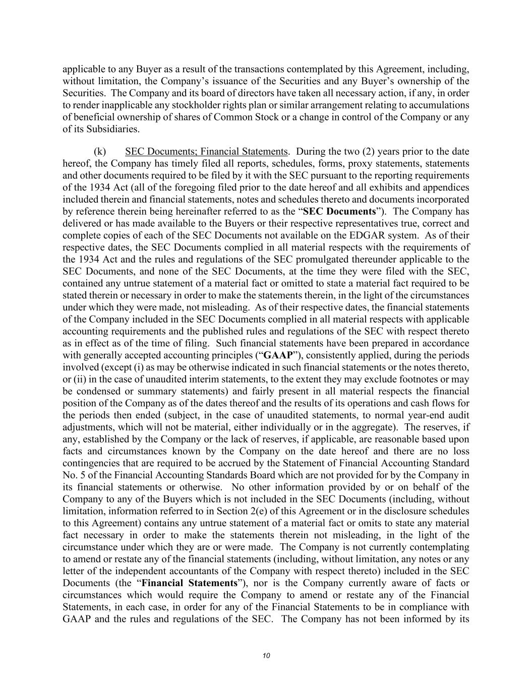10 applicable to any Buyer as a result of the transactions contemplated by this Agreement, including, without limitation, the Company’s issuance of the Securities and any Buyer’s ownership of the Securities. The Company and its board of directors have taken all necessary action, if any, in order to render inapplicable any stockholder rights plan or similar arrangement relating to accumulations of beneficial ownership of shares of Common Stock or a change in control of the Company or any of its Subsidiaries. (k) SEC Documents; Financial Statements. During the two (2) years prior to the date hereof, the Company has timely filed all reports, schedules, forms, proxy statements, statements and other documents required to be filed by it with the SEC pursuant to the reporting requirements of the 1934 Act (all of the foregoing filed prior to the date hereof and all exhibits and appendices included therein and financial statements, notes and schedules thereto and documents incorporated by reference therein being hereinafter referred to as the “SEC Documents”). The Company has delivered or has made available to the Buyers or their respective representatives true, correct and complete copies of each of the SEC Documents not available on the EDGAR system. As of their respective dates, the SEC Documents complied in all material respects with the requirements of the 1934 Act and the rules and regulations of the SEC promulgated thereunder applicable to the SEC Documents, and none of the SEC Documents, at the time they were filed with the SEC, contained any untrue statement of a material fact or omitted to state a material fact required to be stated therein or necessary in order to make the statements therein, in the light of the circumstances under which they were made, not misleading. As of their respective dates, the financial statements of the Company included in the SEC Documents complied in all material respects with applicable accounting requirements and the published rules and regulations of the SEC with respect thereto as in effect as of the time of filing. Such financial statements have been prepared in accordance with generally accepted accounting principles (“GAAP”), consistently applied, during the periods involved (except (i) as may be otherwise indicated in such financial statements or the notes thereto, or (ii) in the case of unaudited interim statements, to the extent they may exclude footnotes or may be condensed or summary statements) and fairly present in all material respects the financial position of the Company as of the dates thereof and the results of its operations and cash flows for the periods then ended (subject, in the case of unaudited statements, to normal year-end audit adjustments, which will not be material, either individually or in the aggregate). The reserves, if any, established by the Company or the lack of reserves, if applicable, are reasonable based upon facts and circumstances known by the Company on the date hereof and there are no loss contingencies that are required to be accrued by the Statement of Financial Accounting Standard No. 5 of the Financial Accounting Standards Board which are not provided for by the Company in its financial statements or otherwise. No other information provided by or on behalf of the Company to any of the Buyers which is not included in the SEC Documents (including, without limitation, information referred to in Section 2(e) of this Agreement or in the disclosure schedules to this Agreement) contains any untrue statement of a material fact or omits to state any material fact necessary in order to make the statements therein not misleading, in the light of the circumstance under which they are or were made. The Company is not currently contemplating to amend or restate any of the financial statements (including, without limitation, any notes or any letter of the independent accountants of the Company with respect thereto) included in the SEC Documents (the “Financial Statements”), nor is the Company currently aware of facts or circumstances which would require the Company to amend or restate any of the Financial Statements, in each case, in order for any of the Financial Statements to be in compliance with GAAP and the rules and regulations of the SEC. The Company has not been informed by its