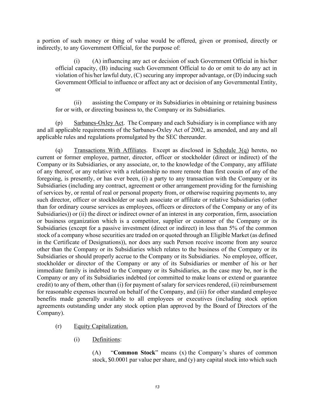 13 a portion of such money or thing of value would be offered, given or promised, directly or indirectly, to any Government Official, for the purpose of: (i) (A) influencing any act or decision of such Government Official in his/her official capacity, (B) inducing such Government Official to do or omit to do any act in violation of his/her lawful duty, (C) securing any improper advantage, or (D) inducing such Government Official to influence or affect any act or decision of any Governmental Entity, or (ii) assisting the Company or its Subsidiaries in obtaining or retaining business for or with, or directing business to, the Company or its Subsidiaries. (p) Sarbanes-Oxley Act. The Company and each Subsidiary is in compliance with any and all applicable requirements of the Sarbanes-Oxley Act of 2002, as amended, and any and all applicable rules and regulations promulgated by the SEC thereunder. (q) Transactions With Affiliates. Except as disclosed in Schedule 3(q) hereto, no current or former employee, partner, director, officer or stockholder (direct or indirect) of the Company or its Subsidiaries, or any associate, or, to the knowledge of the Company, any affiliate of any thereof, or any relative with a relationship no more remote than first cousin of any of the foregoing, is presently, or has ever been, (i) a party to any transaction with the Company or its Subsidiaries (including any contract, agreement or other arrangement providing for the furnishing of services by, or rental of real or personal property from, or otherwise requiring payments to, any such director, officer or stockholder or such associate or affiliate or relative Subsidiaries (other than for ordinary course services as employees, officers or directors of the Company or any of its Subsidiaries)) or (ii) the direct or indirect owner of an interest in any corporation, firm, association or business organization which is a competitor, supplier or customer of the Company or its Subsidiaries (except for a passive investment (direct or indirect) in less than 5% of the common stock of a company whose securities are traded on or quoted through an Eligible Market (as defined in the Certificate of Designations)), nor does any such Person receive income from any source other than the Company or its Subsidiaries which relates to the business of the Company or its Subsidiaries or should properly accrue to the Company or its Subsidiaries. No employee, officer, stockholder or director of the Company or any of its Subsidiaries or member of his or her immediate family is indebted to the Company or its Subsidiaries, as the case may be, nor is the Company or any of its Subsidiaries indebted (or committed to make loans or extend or guarantee credit) to any of them, other than (i) for payment of salary for services rendered, (ii) reimbursement for reasonable expenses incurred on behalf of the Company, and (iii) for other standard employee benefits made generally available to all employees or executives (including stock option agreements outstanding under any stock option plan approved by the Board of Directors of the Company). (r) Equity Capitalization. (i) Definitions: (A) “Common Stock” means (x) the Company’s shares of common stock, $0.0001 par value per share, and (y) any capital stock into which such