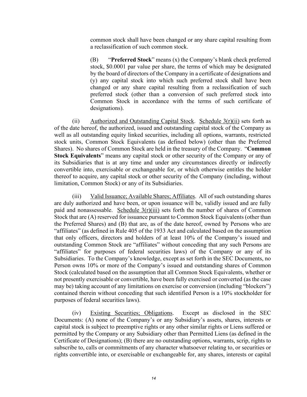 14 common stock shall have been changed or any share capital resulting from a reclassification of such common stock. (B) “Preferred Stock” means (x) the Company’s blank check preferred stock, $0.0001 par value per share, the terms of which may be designated by the board of directors of the Company in a certificate of designations and (y) any capital stock into which such preferred stock shall have been changed or any share capital resulting from a reclassification of such preferred stock (other than a conversion of such preferred stock into Common Stock in accordance with the terms of such certificate of designations). (ii) Authorized and Outstanding Capital Stock. Schedule 3(r)(ii) sets forth as of the date hereof, the authorized, issued and outstanding capital stock of the Company as well as all outstanding equity linked securities, including all options, warrants, restricted stock units, Common Stock Equivalents (as defined below) (other than the Preferred Shares). No shares of Common Stock are held in the treasury of the Company. “Common Stock Equivalents” means any capital stock or other security of the Company or any of its Subsidiaries that is at any time and under any circumstances directly or indirectly convertible into, exercisable or exchangeable for, or which otherwise entitles the holder thereof to acquire, any capital stock or other security of the Company (including, without limitation, Common Stock) or any of its Subsidiaries. (iii) Valid Issuance; Available Shares; Affiliates. All of such outstanding shares are duly authorized and have been, or upon issuance will be, validly issued and are fully paid and nonassessable. Schedule 3(r)(iii) sets forth the number of shares of Common Stock that are (A) reserved for issuance pursuant to Common Stock Equivalents (other than the Preferred Shares) and (B) that are, as of the date hereof, owned by Persons who are “affiliates” (as defined in Rule 405 of the 1933 Act and calculated based on the assumption that only officers, directors and holders of at least 10% of the Company’s issued and outstanding Common Stock are “affiliates” without conceding that any such Persons are “affiliates” for purposes of federal securities laws) of the Company or any of its Subsidiaries. To the Company’s knowledge, except as set forth in the SEC Documents, no Person owns 10% or more of the Company’s issued and outstanding shares of Common Stock (calculated based on the assumption that all Common Stock Equivalents, whether or not presently exercisable or convertible, have been fully exercised or converted (as the case may be) taking account of any limitations on exercise or conversion (including “blockers”) contained therein without conceding that such identified Person is a 10% stockholder for purposes of federal securities laws). (iv) Existing Securities; Obligations. Except as disclosed in the SEC Documents: (A) none of the Company’s or any Subsidiary’s assets, shares, interests or capital stock is subject to preemptive rights or any other similar rights or Liens suffered or permitted by the Company or any Subsidiary other than Permitted Liens (as defined in the Certificate of Designations); (B) there are no outstanding options, warrants, scrip, rights to subscribe to, calls or commitments of any character whatsoever relating to, or securities or rights convertible into, or exercisable or exchangeable for, any shares, interests or capital