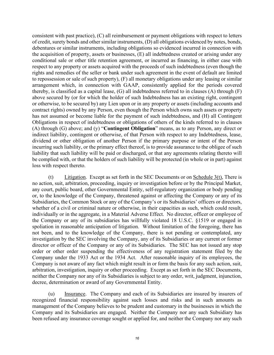 16 consistent with past practice), (C) all reimbursement or payment obligations with respect to letters of credit, surety bonds and other similar instruments, (D) all obligations evidenced by notes, bonds, debentures or similar instruments, including obligations so evidenced incurred in connection with the acquisition of property, assets or businesses, (E) all indebtedness created or arising under any conditional sale or other title retention agreement, or incurred as financing, in either case with respect to any property or assets acquired with the proceeds of such indebtedness (even though the rights and remedies of the seller or bank under such agreement in the event of default are limited to repossession or sale of such property), (F) all monetary obligations under any leasing or similar arrangement which, in connection with GAAP, consistently applied for the periods covered thereby, is classified as a capital lease, (G) all indebtedness referred to in clauses (A) through (F) above secured by (or for which the holder of such Indebtedness has an existing right, contingent or otherwise, to be secured by) any Lien upon or in any property or assets (including accounts and contract rights) owned by any Person, even though the Person which owns such assets or property has not assumed or become liable for the payment of such indebtedness, and (H) all Contingent Obligations in respect of indebtedness or obligations of others of the kinds referred to in clauses (A) through (G) above; and (y) “Contingent Obligation” means, as to any Person, any direct or indirect liability, contingent or otherwise, of that Person with respect to any Indebtedness, lease, dividend or other obligation of another Person if the primary purpose or intent of the Person incurring such liability, or the primary effect thereof, is to provide assurance to the obligee of such liability that such liability will be paid or discharged, or that any agreements relating thereto will be complied with, or that the holders of such liability will be protected (in whole or in part) against loss with respect thereto. (t) Litigation. Except as set forth in the SEC Documents or on Schedule 3(t), There is no action, suit, arbitration, proceeding, inquiry or investigation before or by the Principal Market, any court, public board, other Governmental Entity, self-regulatory organization or body pending or, to the knowledge of the Company, threatened against or affecting the Company or any of its Subsidiaries, the Common Stock or any of the Company’s or its Subsidiaries’ officers or directors, whether of a civil or criminal nature or otherwise, in their capacities as such, which could result, individually or in the aggregate, in a Material Adverse Effect. No director, officer or employee of the Company or any of its subsidiaries has willfully violated 18 U.S.C. §1519 or engaged in spoliation in reasonable anticipation of litigation. Without limitation of the foregoing, there has not been, and to the knowledge of the Company, there is not pending or contemplated, any investigation by the SEC involving the Company, any of its Subsidiaries or any current or former director or officer of the Company or any of its Subsidiaries. The SEC has not issued any stop order or other order suspending the effectiveness of any registration statement filed by the Company under the 1933 Act or the 1934 Act. After reasonable inquiry of its employees, the Company is not aware of any fact which might result in or form the basis for any such action, suit, arbitration, investigation, inquiry or other proceeding. Except as set forth in the SEC Documents, neither the Company nor any of its Subsidiaries is subject to any order, writ, judgment, injunction, decree, determination or award of any Governmental Entity. (u) Insurance. The Company and each of its Subsidiaries are insured by insurers of recognized financial responsibility against such losses and risks and in such amounts as management of the Company believes to be prudent and customary in the businesses in which the Company and its Subsidiaries are engaged. Neither the Company nor any such Subsidiary has been refused any insurance coverage sought or applied for, and neither the Company nor any such