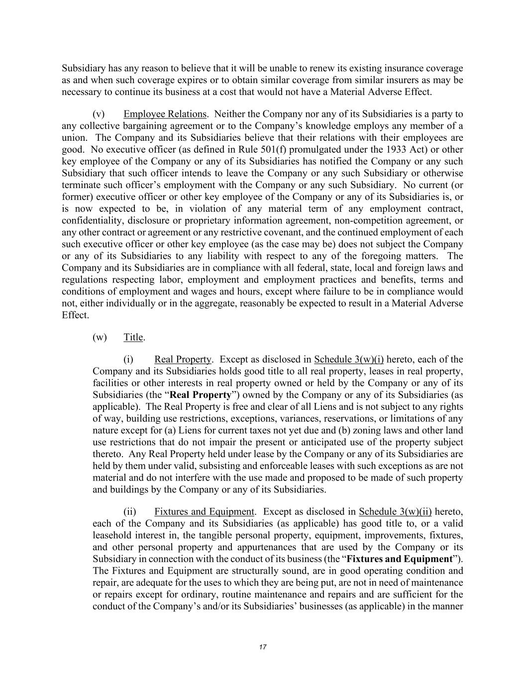 17 Subsidiary has any reason to believe that it will be unable to renew its existing insurance coverage as and when such coverage expires or to obtain similar coverage from similar insurers as may be necessary to continue its business at a cost that would not have a Material Adverse Effect. (v) Employee Relations. Neither the Company nor any of its Subsidiaries is a party to any collective bargaining agreement or to the Company’s knowledge employs any member of a union. The Company and its Subsidiaries believe that their relations with their employees are good. No executive officer (as defined in Rule 501(f) promulgated under the 1933 Act) or other key employee of the Company or any of its Subsidiaries has notified the Company or any such Subsidiary that such officer intends to leave the Company or any such Subsidiary or otherwise terminate such officer’s employment with the Company or any such Subsidiary. No current (or former) executive officer or other key employee of the Company or any of its Subsidiaries is, or is now expected to be, in violation of any material term of any employment contract, confidentiality, disclosure or proprietary information agreement, non-competition agreement, or any other contract or agreement or any restrictive covenant, and the continued employment of each such executive officer or other key employee (as the case may be) does not subject the Company or any of its Subsidiaries to any liability with respect to any of the foregoing matters. The Company and its Subsidiaries are in compliance with all federal, state, local and foreign laws and regulations respecting labor, employment and employment practices and benefits, terms and conditions of employment and wages and hours, except where failure to be in compliance would not, either individually or in the aggregate, reasonably be expected to result in a Material Adverse Effect. (w) Title. (i) Real Property. Except as disclosed in Schedule 3(w)(i) hereto, each of the Company and its Subsidiaries holds good title to all real property, leases in real property, facilities or other interests in real property owned or held by the Company or any of its Subsidiaries (the “Real Property”) owned by the Company or any of its Subsidiaries (as applicable). The Real Property is free and clear of all Liens and is not subject to any rights of way, building use restrictions, exceptions, variances, reservations, or limitations of any nature except for (a) Liens for current taxes not yet due and (b) zoning laws and other land use restrictions that do not impair the present or anticipated use of the property subject thereto. Any Real Property held under lease by the Company or any of its Subsidiaries are held by them under valid, subsisting and enforceable leases with such exceptions as are not material and do not interfere with the use made and proposed to be made of such property and buildings by the Company or any of its Subsidiaries. (ii) Fixtures and Equipment. Except as disclosed in Schedule 3(w)(ii) hereto, each of the Company and its Subsidiaries (as applicable) has good title to, or a valid leasehold interest in, the tangible personal property, equipment, improvements, fixtures, and other personal property and appurtenances that are used by the Company or its Subsidiary in connection with the conduct of its business (the “Fixtures and Equipment”). The Fixtures and Equipment are structurally sound, are in good operating condition and repair, are adequate for the uses to which they are being put, are not in need of maintenance or repairs except for ordinary, routine maintenance and repairs and are sufficient for the conduct of the Company’s and/or its Subsidiaries’ businesses (as applicable) in the manner