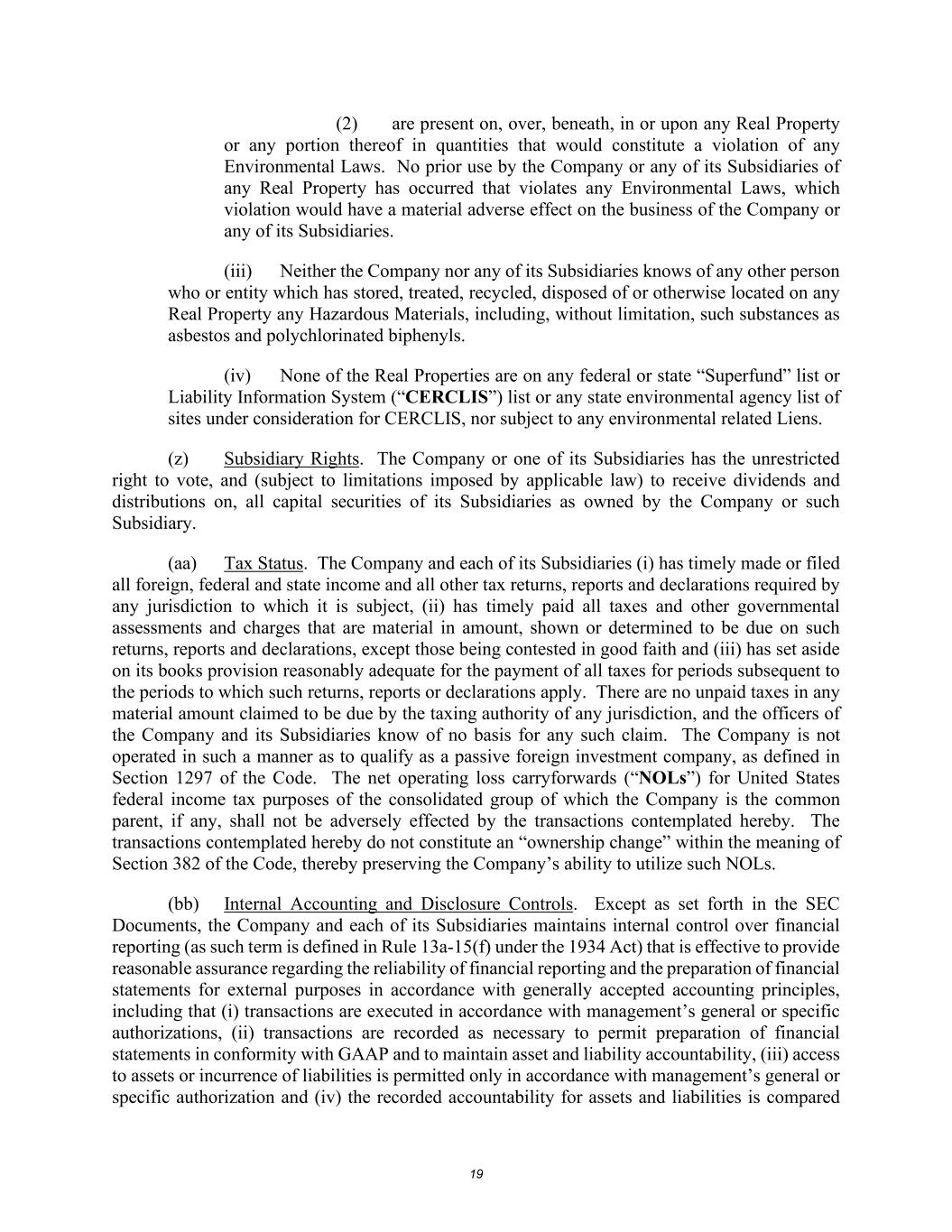 19 (2) are present on, over, beneath, in or upon any Real Property or any portion thereof in quantities that would constitute a violation of any Environmental Laws. No prior use by the Company or any of its Subsidiaries of any Real Property has occurred that violates any Environmental Laws, which violation would have a material adverse effect on the business of the Company or any of its Subsidiaries. (iii) Neither the Company nor any of its Subsidiaries knows of any other person who or entity which has stored, treated, recycled, disposed of or otherwise located on any Real Property any Hazardous Materials, including, without limitation, such substances as asbestos and polychlorinated biphenyls. (iv) None of the Real Properties are on any federal or state “Superfund” list or Liability Information System (“CERCLIS”) list or any state environmental agency list of sites under consideration for CERCLIS, nor subject to any environmental related Liens. (z) Subsidiary Rights. The Company or one of its Subsidiaries has the unrestricted right to vote, and (subject to limitations imposed by applicable law) to receive dividends and distributions on, all capital securities of its Subsidiaries as owned by the Company or such Subsidiary. (aa) Tax Status. The Company and each of its Subsidiaries (i) has timely made or filed all foreign, federal and state income and all other tax returns, reports and declarations required by any jurisdiction to which it is subject, (ii) has timely paid all taxes and other governmental assessments and charges that are material in amount, shown or determined to be due on such returns, reports and declarations, except those being contested in good faith and (iii) has set aside on its books provision reasonably adequate for the payment of all taxes for periods subsequent to the periods to which such returns, reports or declarations apply. There are no unpaid taxes in any material amount claimed to be due by the taxing authority of any jurisdiction, and the officers of the Company and its Subsidiaries know of no basis for any such claim. The Company is not operated in such a manner as to qualify as a passive foreign investment company, as defined in Section 1297 of the Code. The net operating loss carryforwards (“NOLs”) for United States federal income tax purposes of the consolidated group of which the Company is the common parent, if any, shall not be adversely effected by the transactions contemplated hereby. The transactions contemplated hereby do not constitute an “ownership change” within the meaning of Section 382 of the Code, thereby preserving the Company’s ability to utilize such NOLs. (bb) Internal Accounting and Disclosure Controls. Except as set forth in the SEC Documents, the Company and each of its Subsidiaries maintains internal control over financial reporting (as such term is defined in Rule 13a-15(f) under the 1934 Act) that is effective to provide reasonable assurance regarding the reliability of financial reporting and the preparation of financial statements for external purposes in accordance with generally accepted accounting principles, including that (i) transactions are executed in accordance with management’s general or specific authorizations, (ii) transactions are recorded as necessary to permit preparation of financial statements in conformity with GAAP and to maintain asset and liability accountability, (iii) access to assets or incurrence of liabilities is permitted only in accordance with management’s general or specific authorization and (iv) the recorded accountability for assets and liabilities is compared