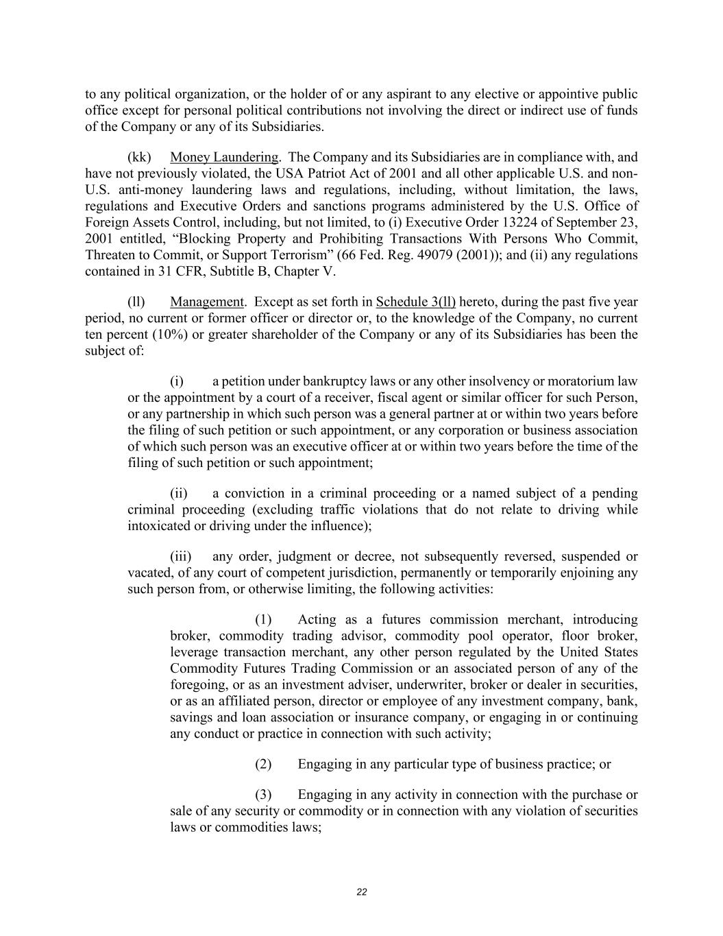 22 to any political organization, or the holder of or any aspirant to any elective or appointive public office except for personal political contributions not involving the direct or indirect use of funds of the Company or any of its Subsidiaries. (kk) Money Laundering. The Company and its Subsidiaries are in compliance with, and have not previously violated, the USA Patriot Act of 2001 and all other applicable U.S. and non- U.S. anti-money laundering laws and regulations, including, without limitation, the laws, regulations and Executive Orders and sanctions programs administered by the U.S. Office of Foreign Assets Control, including, but not limited, to (i) Executive Order 13224 of September 23, 2001 entitled, “Blocking Property and Prohibiting Transactions With Persons Who Commit, Threaten to Commit, or Support Terrorism” (66 Fed. Reg. 49079 (2001)); and (ii) any regulations contained in 31 CFR, Subtitle B, Chapter V. (ll) Management. Except as set forth in Schedule 3(ll) hereto, during the past five year period, no current or former officer or director or, to the knowledge of the Company, no current ten percent (10%) or greater shareholder of the Company or any of its Subsidiaries has been the subject of: (i) a petition under bankruptcy laws or any other insolvency or moratorium law or the appointment by a court of a receiver, fiscal agent or similar officer for such Person, or any partnership in which such person was a general partner at or within two years before the filing of such petition or such appointment, or any corporation or business association of which such person was an executive officer at or within two years before the time of the filing of such petition or such appointment; (ii) a conviction in a criminal proceeding or a named subject of a pending criminal proceeding (excluding traffic violations that do not relate to driving while intoxicated or driving under the influence); (iii) any order, judgment or decree, not subsequently reversed, suspended or vacated, of any court of competent jurisdiction, permanently or temporarily enjoining any such person from, or otherwise limiting, the following activities: (1) Acting as a futures commission merchant, introducing broker, commodity trading advisor, commodity pool operator, floor broker, leverage transaction merchant, any other person regulated by the United States Commodity Futures Trading Commission or an associated person of any of the foregoing, or as an investment adviser, underwriter, broker or dealer in securities, or as an affiliated person, director or employee of any investment company, bank, savings and loan association or insurance company, or engaging in or continuing any conduct or practice in connection with such activity; (2) Engaging in any particular type of business practice; or (3) Engaging in any activity in connection with the purchase or sale of any security or commodity or in connection with any violation of securities laws or commodities laws;