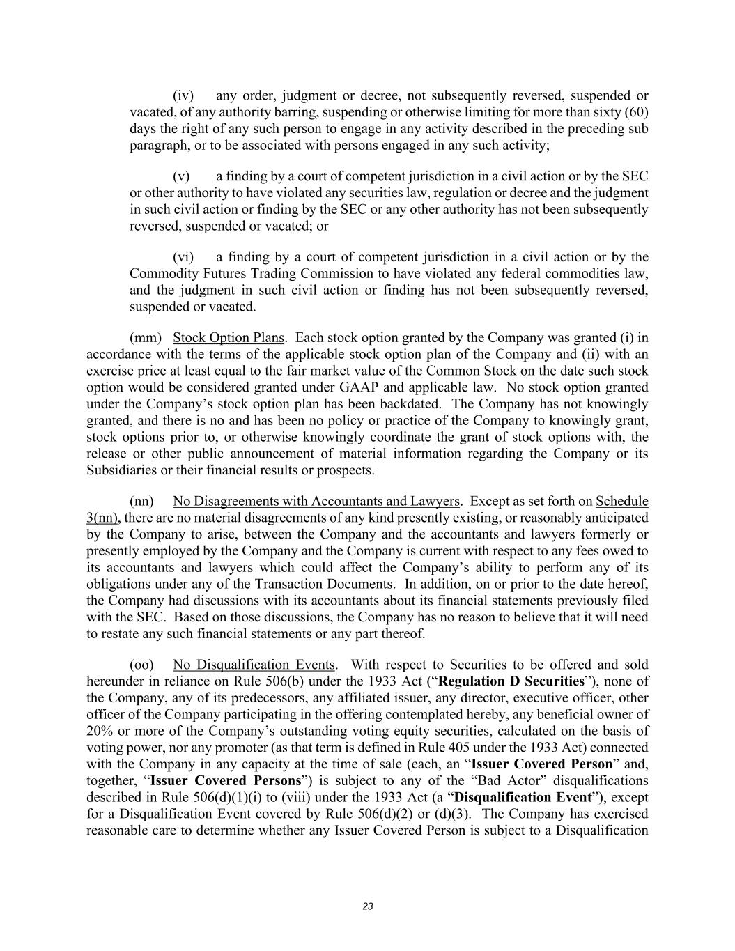 23 (iv) any order, judgment or decree, not subsequently reversed, suspended or vacated, of any authority barring, suspending or otherwise limiting for more than sixty (60) days the right of any such person to engage in any activity described in the preceding sub paragraph, or to be associated with persons engaged in any such activity; (v) a finding by a court of competent jurisdiction in a civil action or by the SEC or other authority to have violated any securities law, regulation or decree and the judgment in such civil action or finding by the SEC or any other authority has not been subsequently reversed, suspended or vacated; or (vi) a finding by a court of competent jurisdiction in a civil action or by the Commodity Futures Trading Commission to have violated any federal commodities law, and the judgment in such civil action or finding has not been subsequently reversed, suspended or vacated. (mm) Stock Option Plans. Each stock option granted by the Company was granted (i) in accordance with the terms of the applicable stock option plan of the Company and (ii) with an exercise price at least equal to the fair market value of the Common Stock on the date such stock option would be considered granted under GAAP and applicable law. No stock option granted under the Company’s stock option plan has been backdated. The Company has not knowingly granted, and there is no and has been no policy or practice of the Company to knowingly grant, stock options prior to, or otherwise knowingly coordinate the grant of stock options with, the release or other public announcement of material information regarding the Company or its Subsidiaries or their financial results or prospects. (nn) No Disagreements with Accountants and Lawyers. Except as set forth on Schedule 3(nn), there are no material disagreements of any kind presently existing, or reasonably anticipated by the Company to arise, between the Company and the accountants and lawyers formerly or presently employed by the Company and the Company is current with respect to any fees owed to its accountants and lawyers which could affect the Company’s ability to perform any of its obligations under any of the Transaction Documents. In addition, on or prior to the date hereof, the Company had discussions with its accountants about its financial statements previously filed with the SEC. Based on those discussions, the Company has no reason to believe that it will need to restate any such financial statements or any part thereof. (oo) No Disqualification Events. With respect to Securities to be offered and sold hereunder in reliance on Rule 506(b) under the 1933 Act (“Regulation D Securities”), none of the Company, any of its predecessors, any affiliated issuer, any director, executive officer, other officer of the Company participating in the offering contemplated hereby, any beneficial owner of 20% or more of the Company’s outstanding voting equity securities, calculated on the basis of voting power, nor any promoter (as that term is defined in Rule 405 under the 1933 Act) connected with the Company in any capacity at the time of sale (each, an “Issuer Covered Person” and, together, “Issuer Covered Persons”) is subject to any of the “Bad Actor” disqualifications described in Rule 506(d)(1)(i) to (viii) under the 1933 Act (a “Disqualification Event”), except for a Disqualification Event covered by Rule 506(d)(2) or (d)(3). The Company has exercised reasonable care to determine whether any Issuer Covered Person is subject to a Disqualification