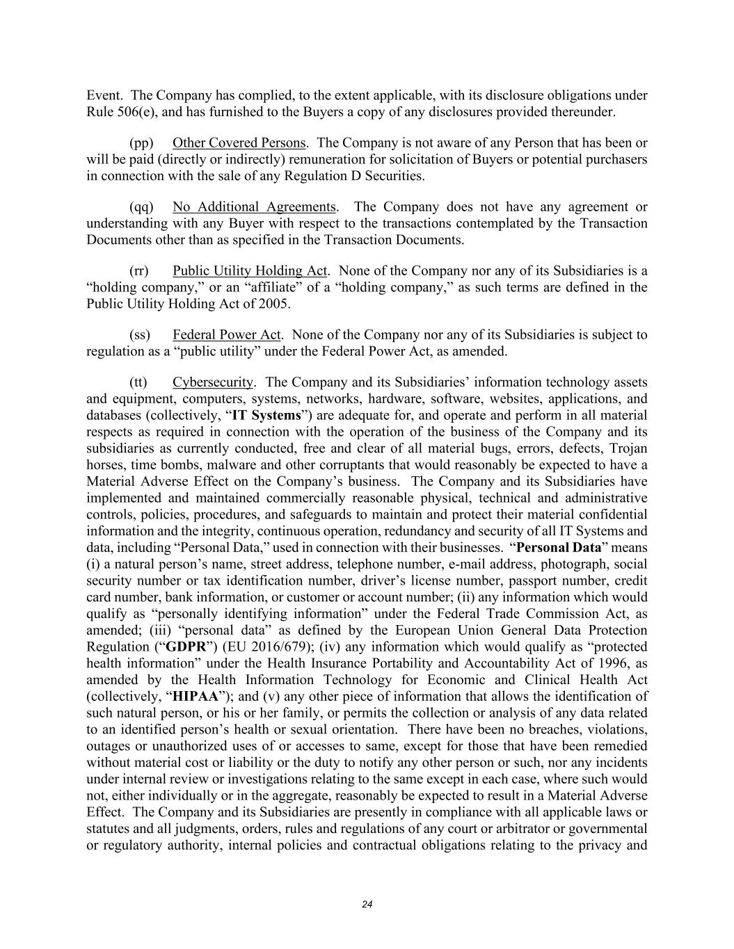 24 Event. The Company has complied, to the extent applicable, with its disclosure obligations under Rule 506(e), and has furnished to the Buyers a copy of any disclosures provided thereunder. (pp) Other Covered Persons. The Company is not aware of any Person that has been or will be paid (directly or indirectly) remuneration for solicitation of Buyers or potential purchasers in connection with the sale of any Regulation D Securities. (qq) No Additional Agreements. The Company does not have any agreement or understanding with any Buyer with respect to the transactions contemplated by the Transaction Documents other than as specified in the Transaction Documents. (rr) Public Utility Holding Act. None of the Company nor any of its Subsidiaries is a “holding company,” or an “affiliate” of a “holding company,” as such terms are defined in the Public Utility Holding Act of 2005. (ss) Federal Power Act. None of the Company nor any of its Subsidiaries is subject to regulation as a “public utility” under the Federal Power Act, as amended. (tt) Cybersecurity. The Company and its Subsidiaries’ information technology assets and equipment, computers, systems, networks, hardware, software, websites, applications, and databases (collectively, “IT Systems”) are adequate for, and operate and perform in all material respects as required in connection with the operation of the business of the Company and its subsidiaries as currently conducted, free and clear of all material bugs, errors, defects, Trojan horses, time bombs, malware and other corruptants that would reasonably be expected to have a Material Adverse Effect on the Company’s business. The Company and its Subsidiaries have implemented and maintained commercially reasonable physical, technical and administrative controls, policies, procedures, and safeguards to maintain and protect their material confidential information and the integrity, continuous operation, redundancy and security of all IT Systems and data, including “Personal Data,” used in connection with their businesses. “Personal Data” means (i) a natural person’s name, street address, telephone number, e-mail address, photograph, social security number or tax identification number, driver’s license number, passport number, credit card number, bank information, or customer or account number; (ii) any information which would qualify as “personally identifying information” under the Federal Trade Commission Act, as amended; (iii) “personal data” as defined by the European Union General Data Protection Regulation (“GDPR”) (EU 2016/679); (iv) any information which would qualify as “protected health information” under the Health Insurance Portability and Accountability Act of 1996, as amended by the Health Information Technology for Economic and Clinical Health Act (collectively, “HIPAA”); and (v) any other piece of information that allows the identification of such natural person, or his or her family, or permits the collection or analysis of any data related to an identified person’s health or sexual orientation. There have been no breaches, violations, outages or unauthorized uses of or accesses to same, except for those that have been remedied without material cost or liability or the duty to notify any other person or such, nor any incidents under internal review or investigations relating to the same except in each case, where such would not, either individually or in the aggregate, reasonably be expected to result in a Material Adverse Effect. The Company and its Subsidiaries are presently in compliance with all applicable laws or statutes and all judgments, orders, rules and regulations of any court or arbitrator or governmental or regulatory authority, internal policies and contractual obligations relating to the privacy and