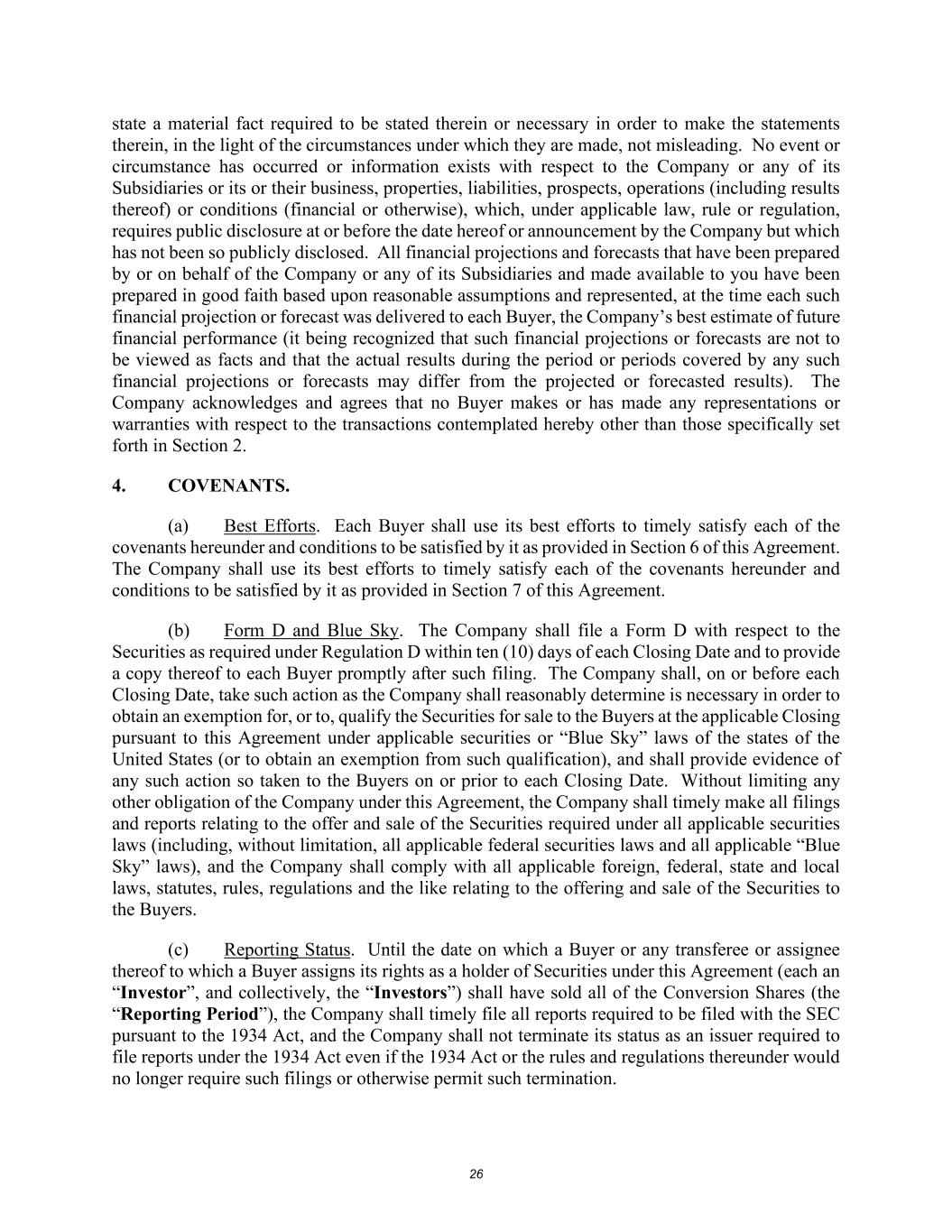 26 state a material fact required to be stated therein or necessary in order to make the statements therein, in the light of the circumstances under which they are made, not misleading. No event or circumstance has occurred or information exists with respect to the Company or any of its Subsidiaries or its or their business, properties, liabilities, prospects, operations (including results thereof) or conditions (financial or otherwise), which, under applicable law, rule or regulation, requires public disclosure at or before the date hereof or announcement by the Company but which has not been so publicly disclosed. All financial projections and forecasts that have been prepared by or on behalf of the Company or any of its Subsidiaries and made available to you have been prepared in good faith based upon reasonable assumptions and represented, at the time each such financial projection or forecast was delivered to each Buyer, the Company’s best estimate of future financial performance (it being recognized that such financial projections or forecasts are not to be viewed as facts and that the actual results during the period or periods covered by any such financial projections or forecasts may differ from the projected or forecasted results). The Company acknowledges and agrees that no Buyer makes or has made any representations or warranties with respect to the transactions contemplated hereby other than those specifically set forth in Section 2. 4. COVENANTS. (a) Best Efforts. Each Buyer shall use its best efforts to timely satisfy each of the covenants hereunder and conditions to be satisfied by it as provided in Section 6 of this Agreement. The Company shall use its best efforts to timely satisfy each of the covenants hereunder and conditions to be satisfied by it as provided in Section 7 of this Agreement. (b) Form D and Blue Sky. The Company shall file a Form D with respect to the Securities as required under Regulation D within ten (10) days of each Closing Date and to provide a copy thereof to each Buyer promptly after such filing. The Company shall, on or before each Closing Date, take such action as the Company shall reasonably determine is necessary in order to obtain an exemption for, or to, qualify the Securities for sale to the Buyers at the applicable Closing pursuant to this Agreement under applicable securities or “Blue Sky” laws of the states of the United States (or to obtain an exemption from such qualification), and shall provide evidence of any such action so taken to the Buyers on or prior to each Closing Date. Without limiting any other obligation of the Company under this Agreement, the Company shall timely make all filings and reports relating to the offer and sale of the Securities required under all applicable securities laws (including, without limitation, all applicable federal securities laws and all applicable “Blue Sky” laws), and the Company shall comply with all applicable foreign, federal, state and local laws, statutes, rules, regulations and the like relating to the offering and sale of the Securities to the Buyers. (c) Reporting Status. Until the date on which a Buyer or any transferee or assignee thereof to which a Buyer assigns its rights as a holder of Securities under this Agreement (each an “Investor”, and collectively, the “Investors”) shall have sold all of the Conversion Shares (the “Reporting Period”), the Company shall timely file all reports required to be filed with the SEC pursuant to the 1934 Act, and the Company shall not terminate its status as an issuer required to file reports under the 1934 Act even if the 1934 Act or the rules and regulations thereunder would no longer require such filings or otherwise permit such termination.