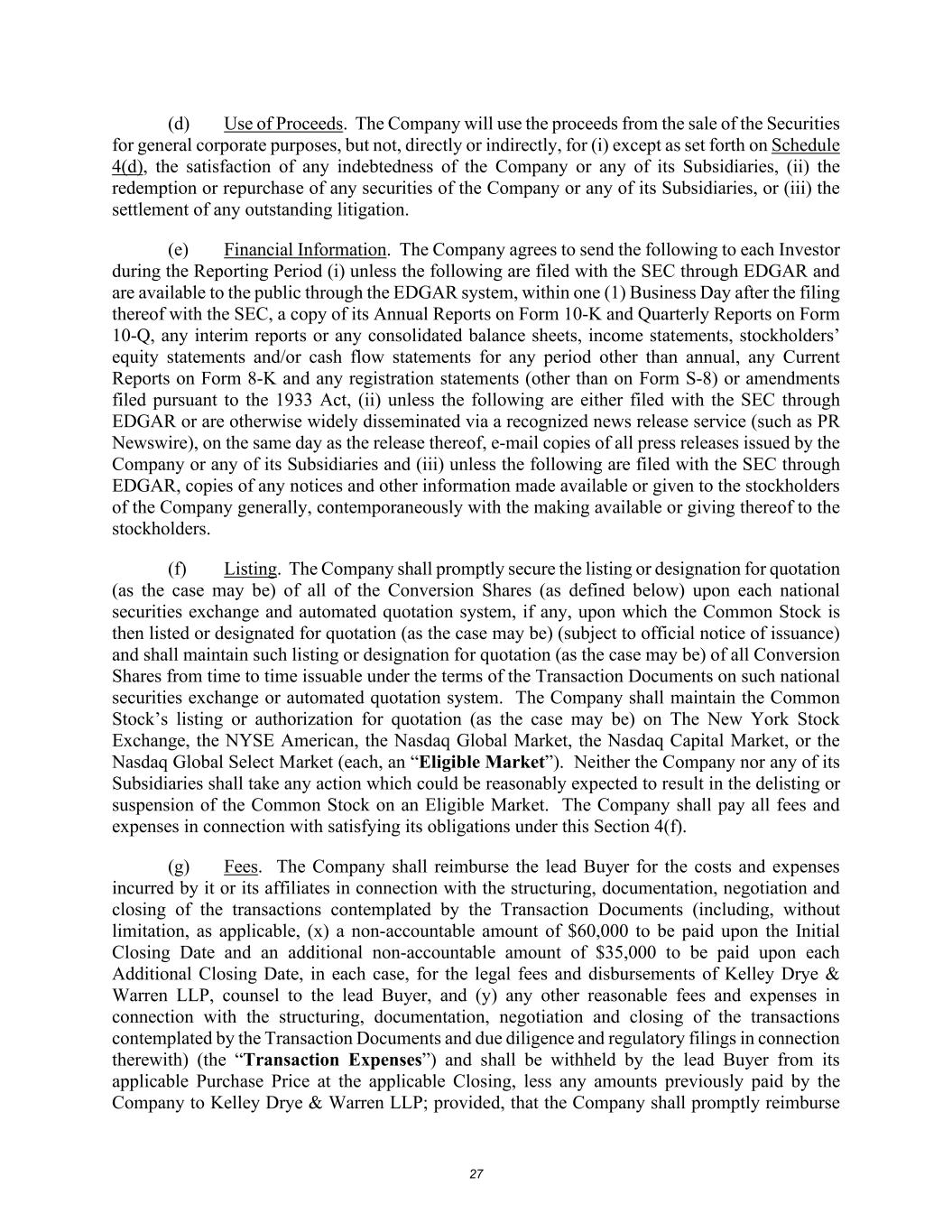 27 (d) Use of Proceeds. The Company will use the proceeds from the sale of the Securities for general corporate purposes, but not, directly or indirectly, for (i) except as set forth on Schedule 4(d), the satisfaction of any indebtedness of the Company or any of its Subsidiaries, (ii) the redemption or repurchase of any securities of the Company or any of its Subsidiaries, or (iii) the settlement of any outstanding litigation. (e) Financial Information. The Company agrees to send the following to each Investor during the Reporting Period (i) unless the following are filed with the SEC through EDGAR and are available to the public through the EDGAR system, within one (1) Business Day after the filing thereof with the SEC, a copy of its Annual Reports on Form 10-K and Quarterly Reports on Form 10-Q, any interim reports or any consolidated balance sheets, income statements, stockholders’ equity statements and/or cash flow statements for any period other than annual, any Current Reports on Form 8-K and any registration statements (other than on Form S-8) or amendments filed pursuant to the 1933 Act, (ii) unless the following are either filed with the SEC through EDGAR or are otherwise widely disseminated via a recognized news release service (such as PR Newswire), on the same day as the release thereof, e-mail copies of all press releases issued by the Company or any of its Subsidiaries and (iii) unless the following are filed with the SEC through EDGAR, copies of any notices and other information made available or given to the stockholders of the Company generally, contemporaneously with the making available or giving thereof to the stockholders. (f) Listing. The Company shall promptly secure the listing or designation for quotation (as the case may be) of all of the Conversion Shares (as defined below) upon each national securities exchange and automated quotation system, if any, upon which the Common Stock is then listed or designated for quotation (as the case may be) (subject to official notice of issuance) and shall maintain such listing or designation for quotation (as the case may be) of all Conversion Shares from time to time issuable under the terms of the Transaction Documents on such national securities exchange or automated quotation system. The Company shall maintain the Common Stock’s listing or authorization for quotation (as the case may be) on The New York Stock Exchange, the NYSE American, the Nasdaq Global Market, the Nasdaq Capital Market, or the Nasdaq Global Select Market (each, an “Eligible Market”). Neither the Company nor any of its Subsidiaries shall take any action which could be reasonably expected to result in the delisting or suspension of the Common Stock on an Eligible Market. The Company shall pay all fees and expenses in connection with satisfying its obligations under this Section 4(f). (g) Fees. The Company shall reimburse the lead Buyer for the costs and expenses incurred by it or its affiliates in connection with the structuring, documentation, negotiation and closing of the transactions contemplated by the Transaction Documents (including, without limitation, as applicable, (x) a non-accountable amount of $60,000 to be paid upon the Initial Closing Date and an additional non-accountable amount of $35,000 to be paid upon each Additional Closing Date, in each case, for the legal fees and disbursements of Kelley Drye & Warren LLP, counsel to the lead Buyer, and (y) any other reasonable fees and expenses in connection with the structuring, documentation, negotiation and closing of the transactions contemplated by the Transaction Documents and due diligence and regulatory filings in connection therewith) (the “Transaction Expenses”) and shall be withheld by the lead Buyer from its applicable Purchase Price at the applicable Closing, less any amounts previously paid by the Company to Kelley Drye & Warren LLP; provided, that the Company shall promptly reimburse
